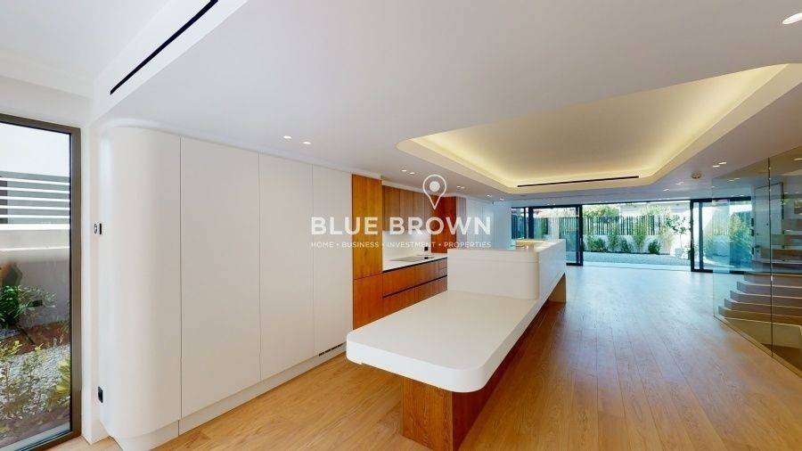 In the Golf area of Glyfada, an exceptional newly built ground-floor maisonette of 290 sq.m. is available for sale. This is an elegant residence with minimal architecture, distinctive design, and a unique character, arranged over three levels, featuring a private landscaped garden of 300.3 sq.m. and a private swimming pool of 44.03 sq.m. The ground floor comprises two living areas, a dining area, a living room with a fireplace, an open-plan kitchen equipped with state-of-the-art built-in appliances, and a master bedroom. All ground-floor spaces have direct access to the garden. The largest part of the garden is located at the rear of the plot, where the swimming pool is situated, along with a beautifully designed outdoor living area featuring a custom-made, retractable, and illuminated pergola. The first level offers two spacious master bedrooms. The larger one includes a walk-in dressing room, a separate two-zone area that can be used as a sitting room or home office, and its own bathroom. The second bedroom features built-in wardrobes and an en-suite bathroom. The basement includes a playroom with kitchenette and natural light, a full bathroom with shower, a laundry room, and a storage room. The property has an A+ energy rating and is equipped with VRV central cooling and heating, underfloor heating with natural gas, a security system, KNX smart home system, and two underground parking spaces with an electric vehicle charging point.