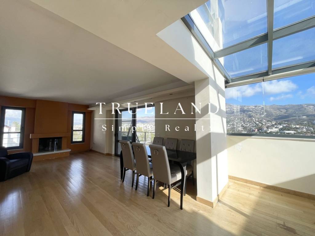 In Ano Vrilissia, in one of the quietest and most privileged locations, a modern, bright maisonette of 140 sq.m. (3rd–4th floor), built in 2009, with a shared swimming pool and unobstructed views of the mountain and the city, is available. The residence has a spacious and bright living room with fireplace, an elegant dining room and a semi-integrated fully equipped kitchen, with direct access to a large terrace with amazing views. On this level there is 1 master bedroom with private bathroom and 1 guest WC. On the upper level there are 2 additional bedrooms and 1 bathroom, with access to a private roof garden with panoramic views. The property has autonomous oil heating, a closed underground parking space and a storage room. An excellent choice for tenants looking for a high quality of life, privacy and direct access to Maroussi, Kifissia, Melissia, Attiki Odos, metro, and private schools. Price: €1,750. TRUELAND REAL ESTATE IKE, Contact Phone: 2144080890, email: info@trueland.gr