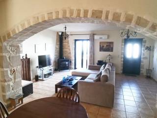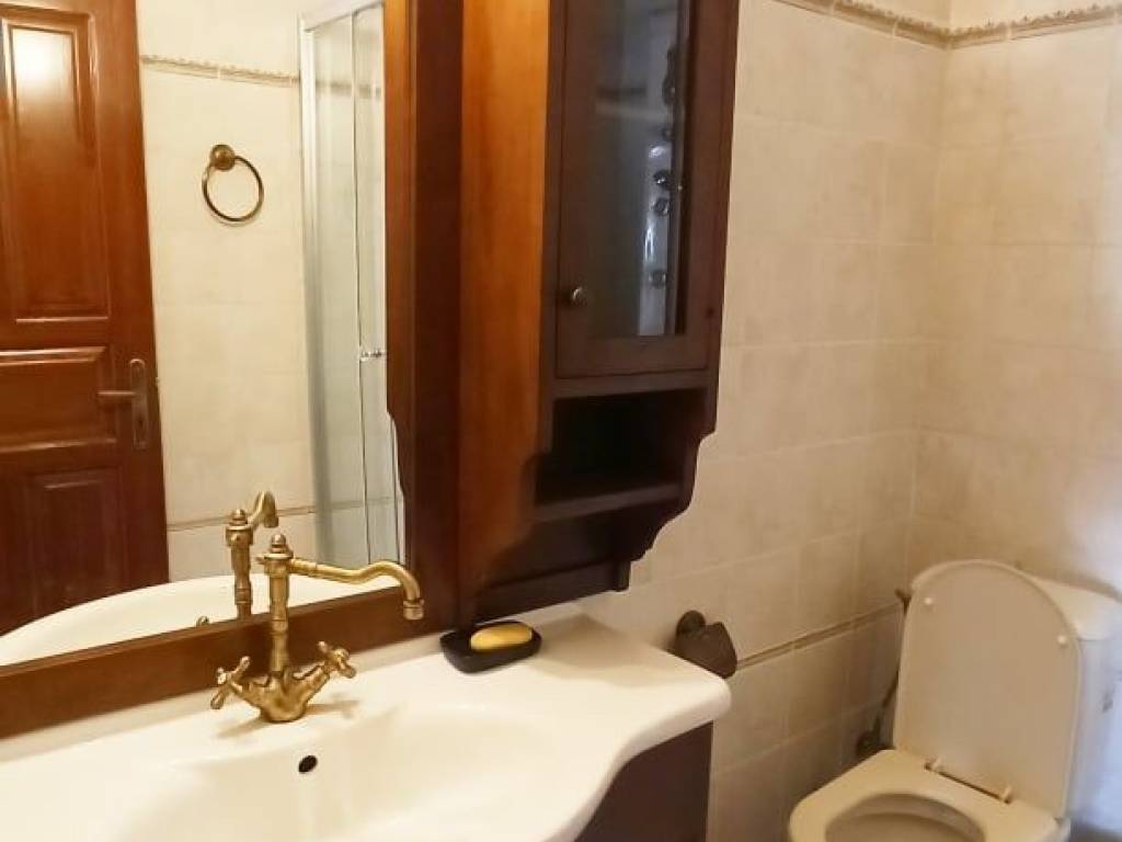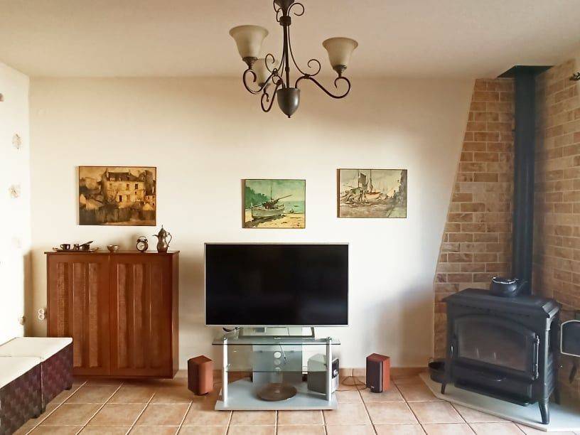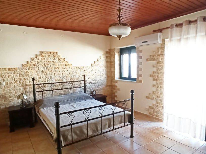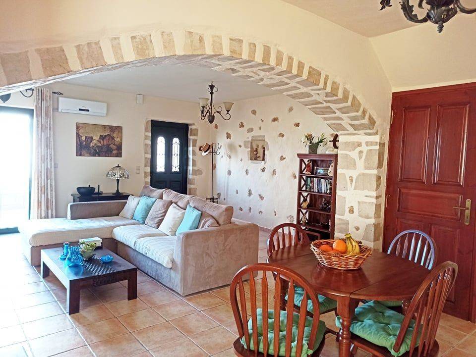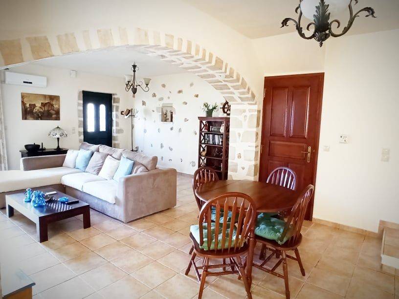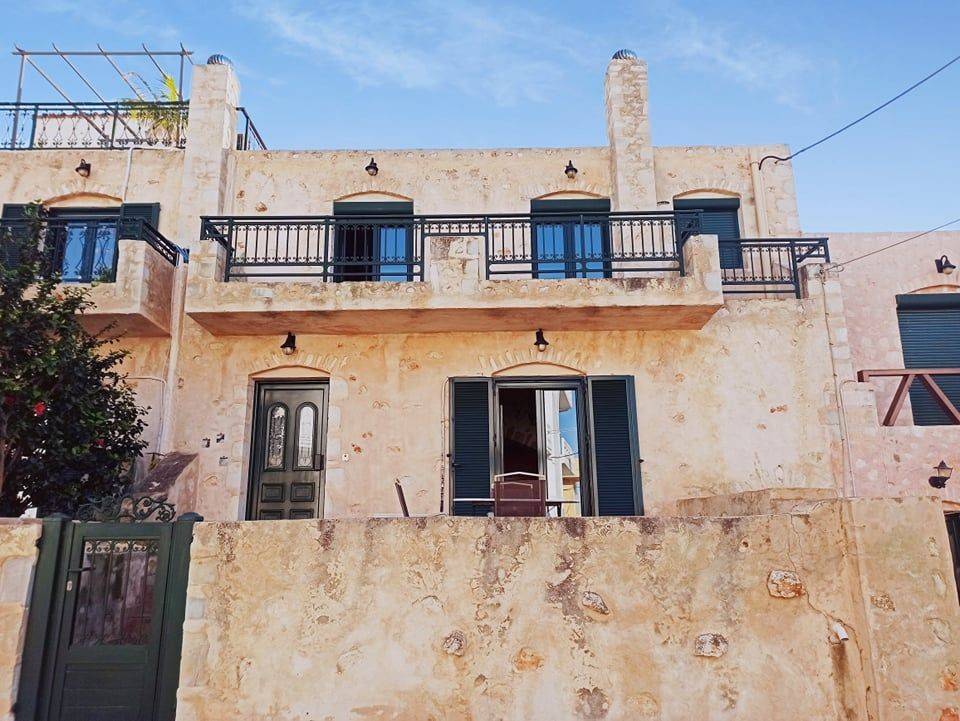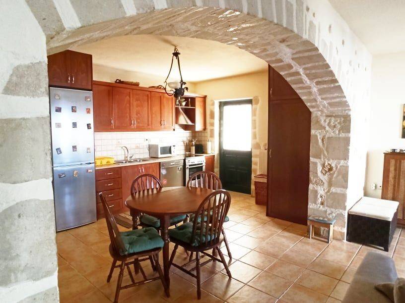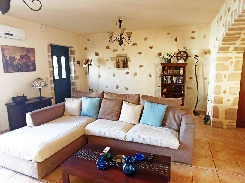 Kalathas, beautiful independent stone 2-story maisonette with sea view, 121.57m2, ground floor and first floor, built in 2004. It is for long term rental, 2+ years. It is fully furnished and equipped with very neat furniture. It has, on the ground floor, a wonderful living room with a wonderful arch and a large corner sofa that becomes a bed and a fully equipped kitchen, electric oven with ceramic hob, large refrigerator, dishwasher, washing machine (in the WC), large TV, stove/fireplace, table with 4 chairs and all the necessary furniture, and WC. On the first floor, accessible by internal staircase, 3 bedrooms, a large bedroom with a large double bed and a beautiful leather armchair and wardrobe, a second bedroom with a sofa bed and wardrobe, a third bedroom that can also be used as an office, and a bathroom with shower and hydromassage column. All bedrooms have closets. It has aluminum frame windows with screens and tiled floors. There are large balconies in front (ground floor and first floor) with sea view, a small balcony in the third room, and a shared courtyard of the complex of 10 stone houses with the stone-built barbecue at the back. It has an individual boiler, for heating and hot water supply. There are 2 air conditioners, one air conditioner in the living room and one air conditioner in the large bedroom. Parking available on the quiet street in front of the house or in the backyard. Pets are not allowed.
