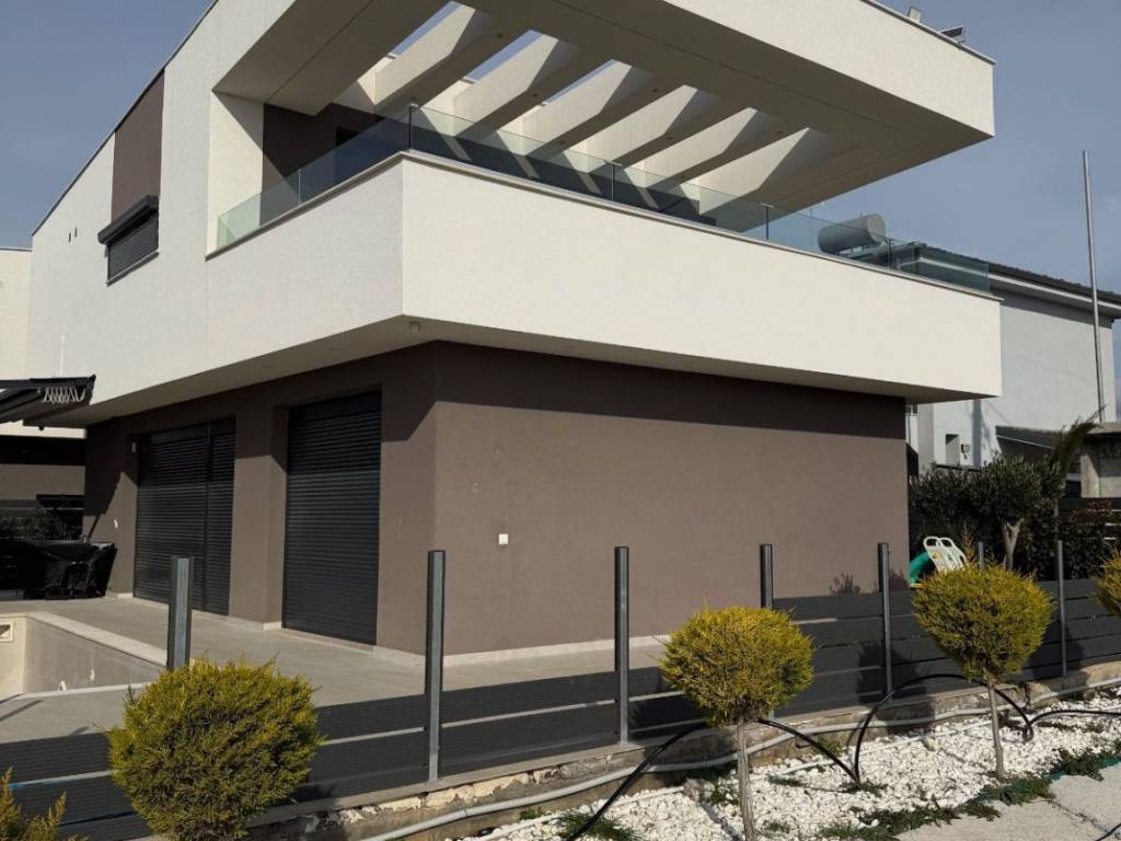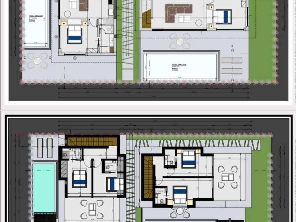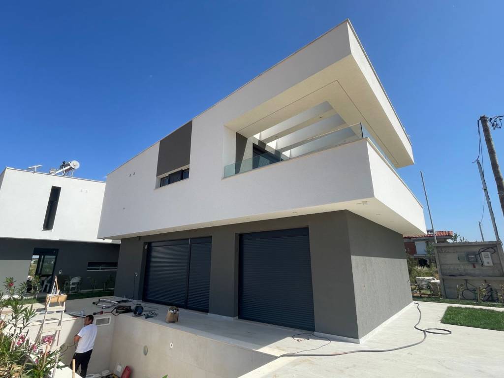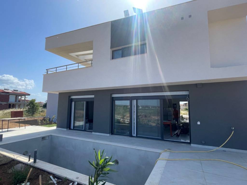Description: For sale there are 2 new villas with pools just 40km from the airport of Thessaloniki close to the long sandy beach and to the town with all year-round infrastructure. Both villas are eligible for the new Golden visa rules. On the ground floor there is a living room combined with a sitting room and a kitchen with built-in furniture and guest wc. From here you can go out to the big terrace, to the solarium, pool zone and BBQ zone. Additionally, we have a master bedroom and en-suite bathroom. On the first floor there are 2 bedrooms both with ensuite bathrooms and exit to the big balcony. Plus there is a storage. • excellent quality of construction • high end quality of materials • modern style architecture • air condition • underfloor heating system – pre installation • Pre installation for alarm system • Pre installation for satellite antenna • Exterior pool (20-26m2) and barbecue area • Parking place • All needed infrastructure in walking distance • Nice sandy beach • Clean sea waters • Construction ends in May2026 • Property for the Golden visa