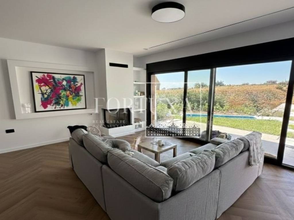 Additional features include built-in wardrobes, fireplace, double-glazed energy-efficient windows, pre-installed alarm system, and air conditioning. The property also offers a private swimming pool, landscaped garden of 240 sq.m., storage room, underground parking space with elevator access, and infrastructure for electric vehicle charging.