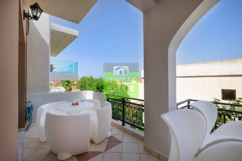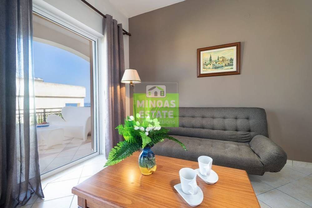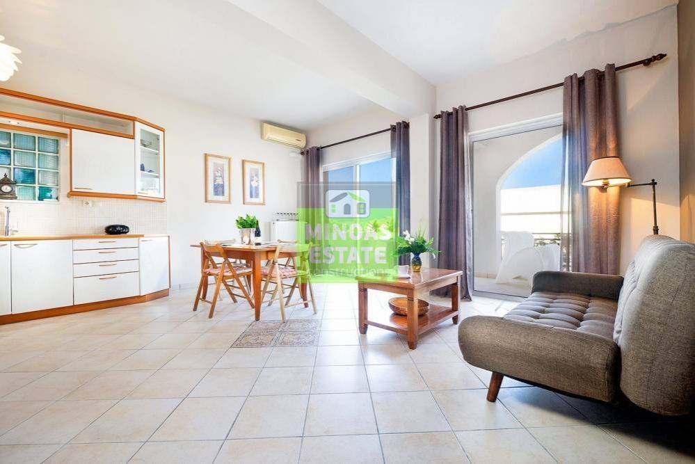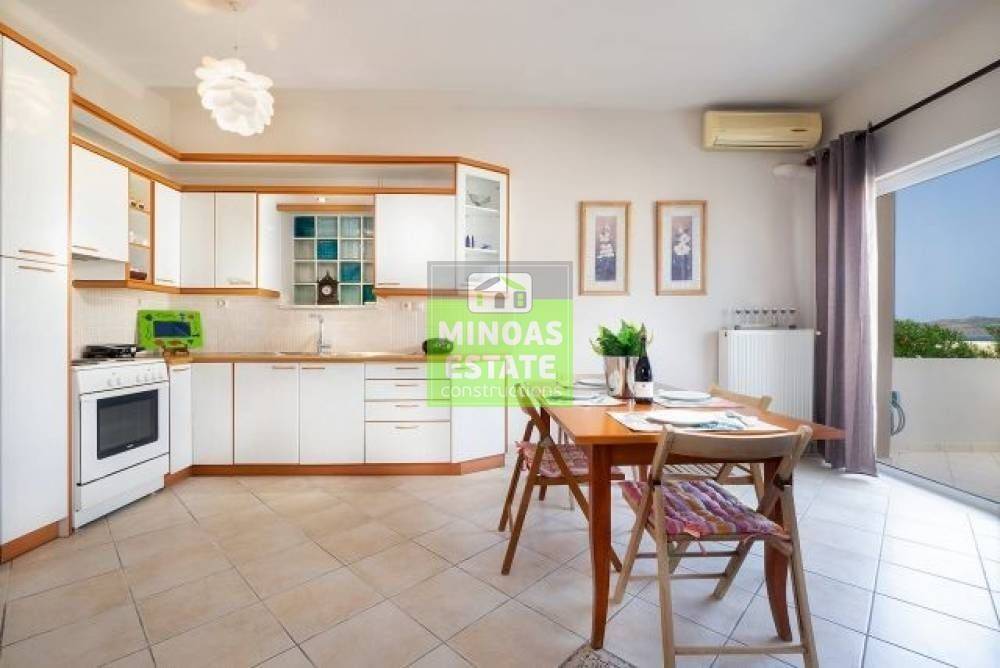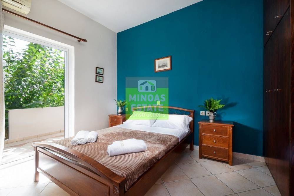 Nea Kydonia, Kato Stalos: For rent, fully renovated Apartment 75 sq.m. luxury, frontage on the 1st floor with individual oil heating and air conditioning. It consists of 2 bedrooms, 1 kitchen-living room, and a bathroom. It is fully furnished, equipped, with electrical appliances, painted and has a nice view, aluminum frames with double glazing, security door, 2 outside parking spaces, tile floors, screens, solar water heater. Located in an ideal spot in the area, Available from 15/12/2025 for long term rental. It is ideal for workers. Price €800 Property Code: #E-200949