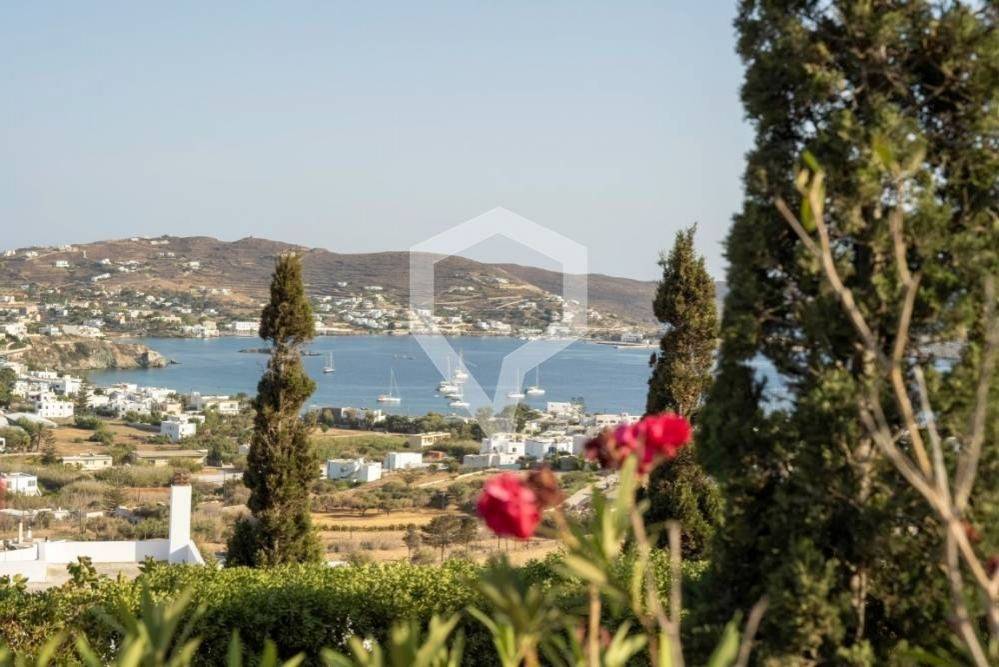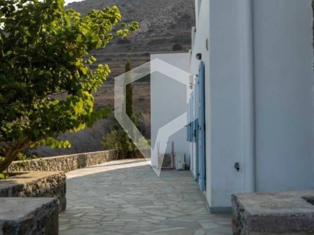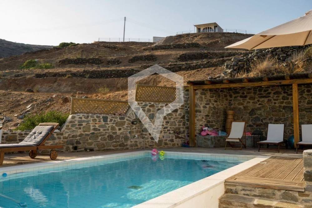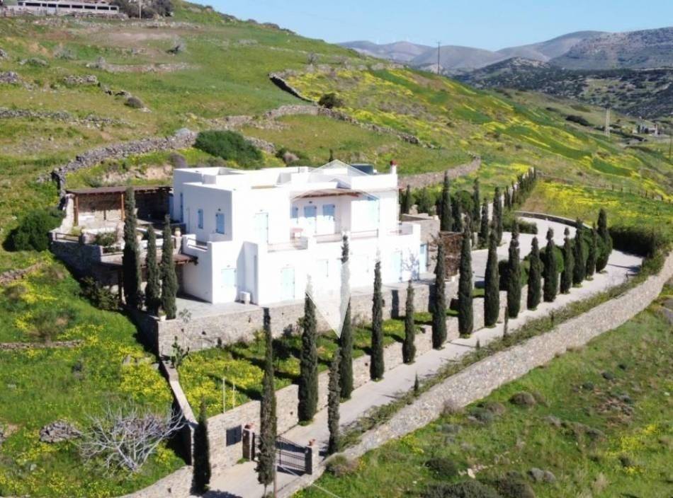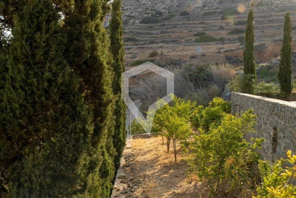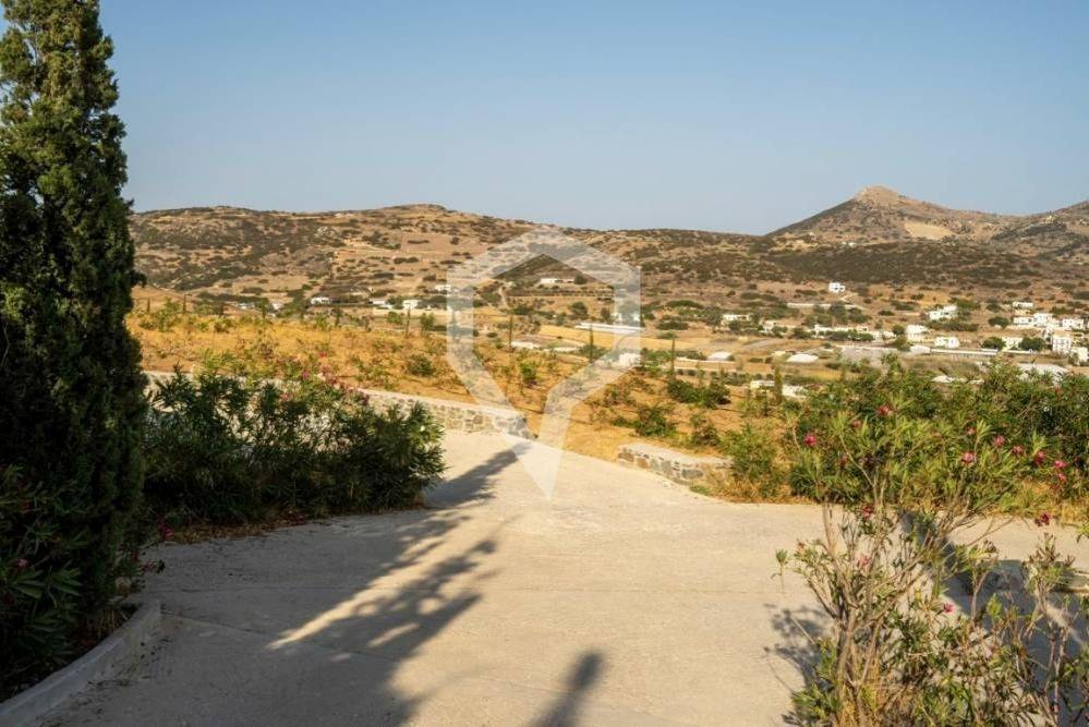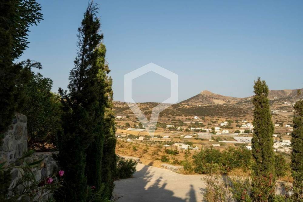The property enjoys a privileged position with panoramic views of the Aegean Sea and is enclosed by a 2-meter-high Cycladic-style stone fence, constructed from local stone. The surrounding area includes a vineyard with approximately 250 plants, a garden with more than 100 cypress trees and 100 oleanders, three orange trees, two mandarin trees, one olive tree, five pomegranate trees, one fig tree, and a swimming pool harmoniously integrated into the landscape.