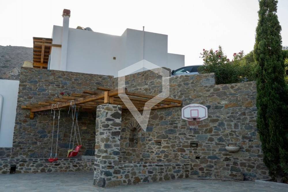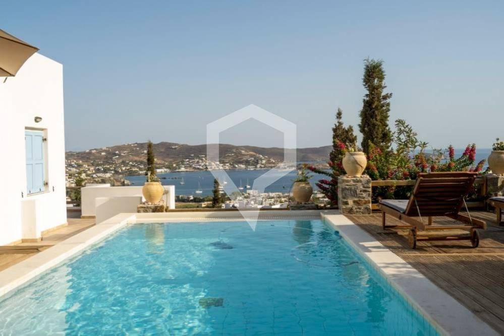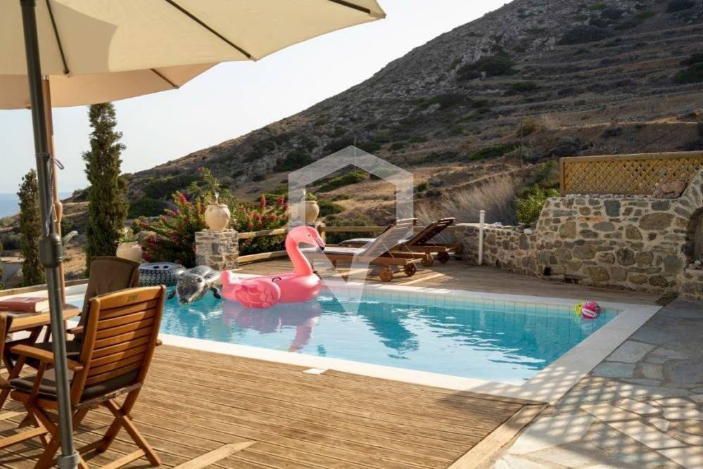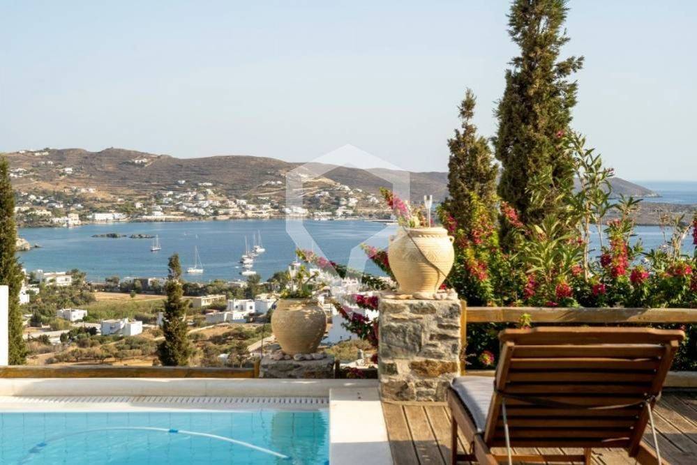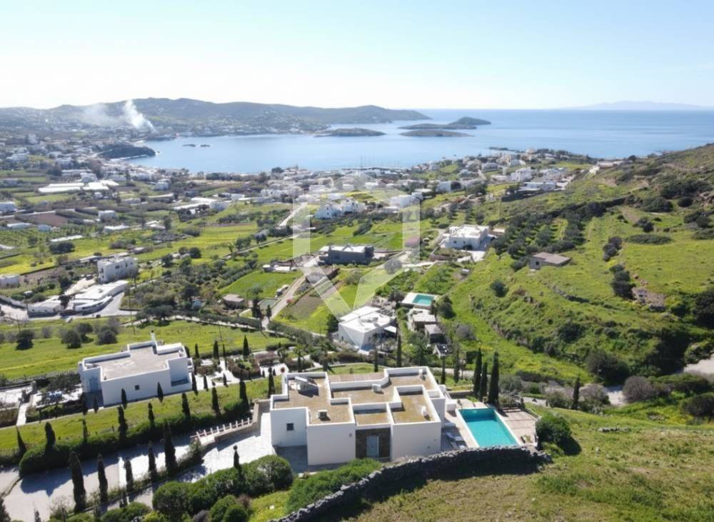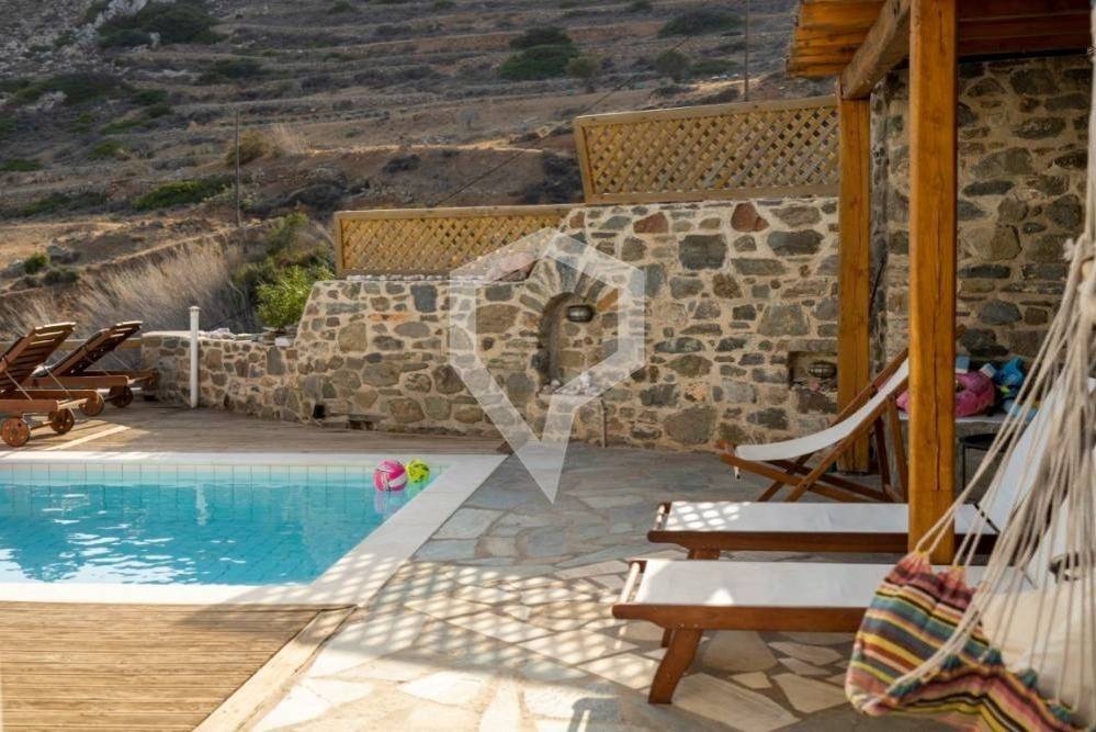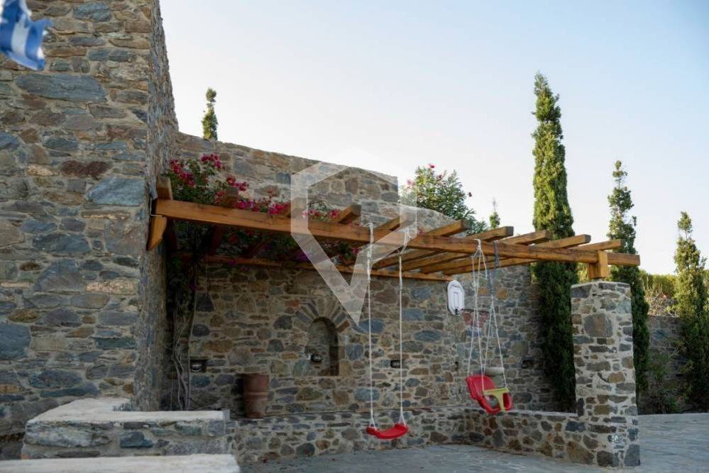 The property enjoys a privileged position with panoramic views of the Aegean Sea and is enclosed by a 2-meter-high Cycladic-style stone fence, constructed from local stone. The surrounding area includes a vineyard with approximately 250 plants, a garden with more than 100 cypress trees and 100 oleanders, three orange trees, two mandarin trees, one olive tree, five pomegranate trees, one fig tree, and a swimming pool harmoniously integrated into the landscape.