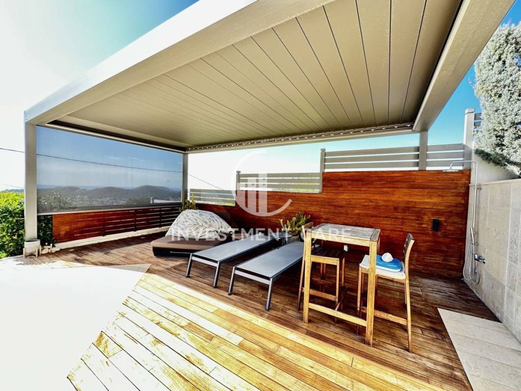 At the main entrance level, with wonderful panoramic views from all rooms, it consists of a large living room with fireplace, office, guest wc, large dining room, comfortable independent kitchen with island and with access to the back with the pergola where the bbq is located outside.