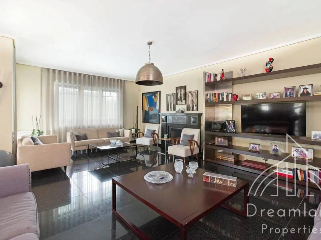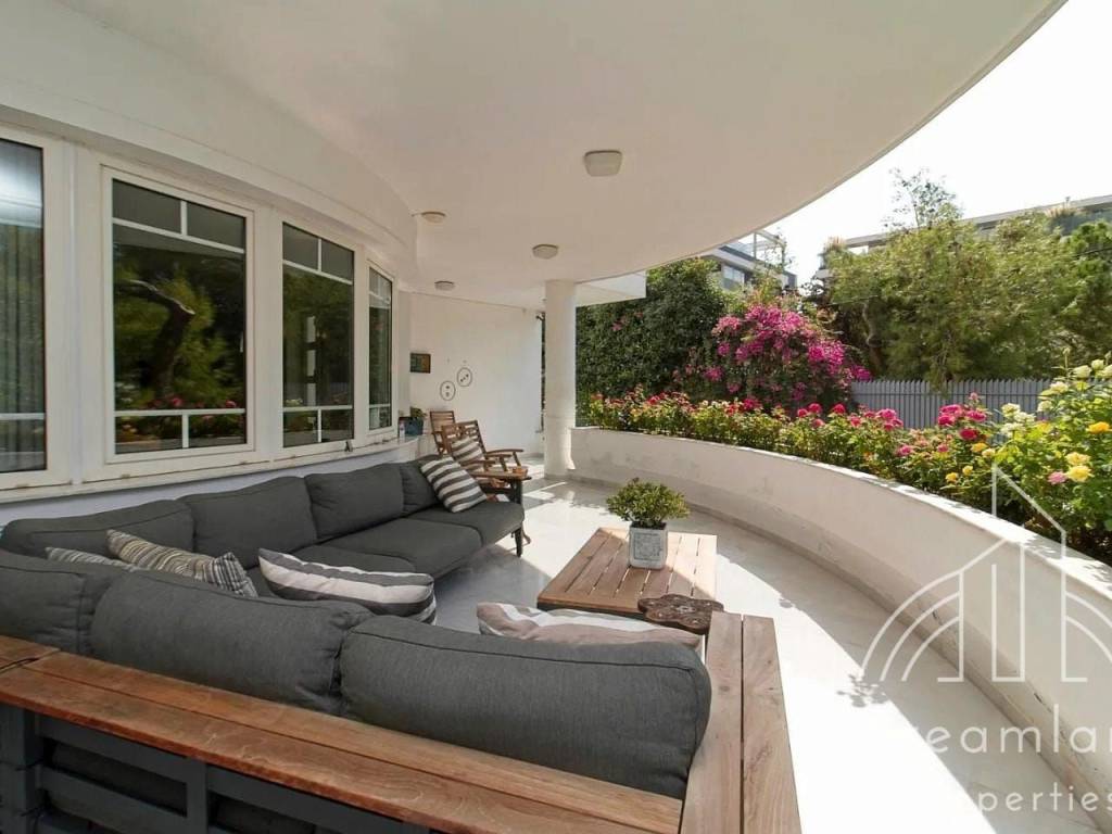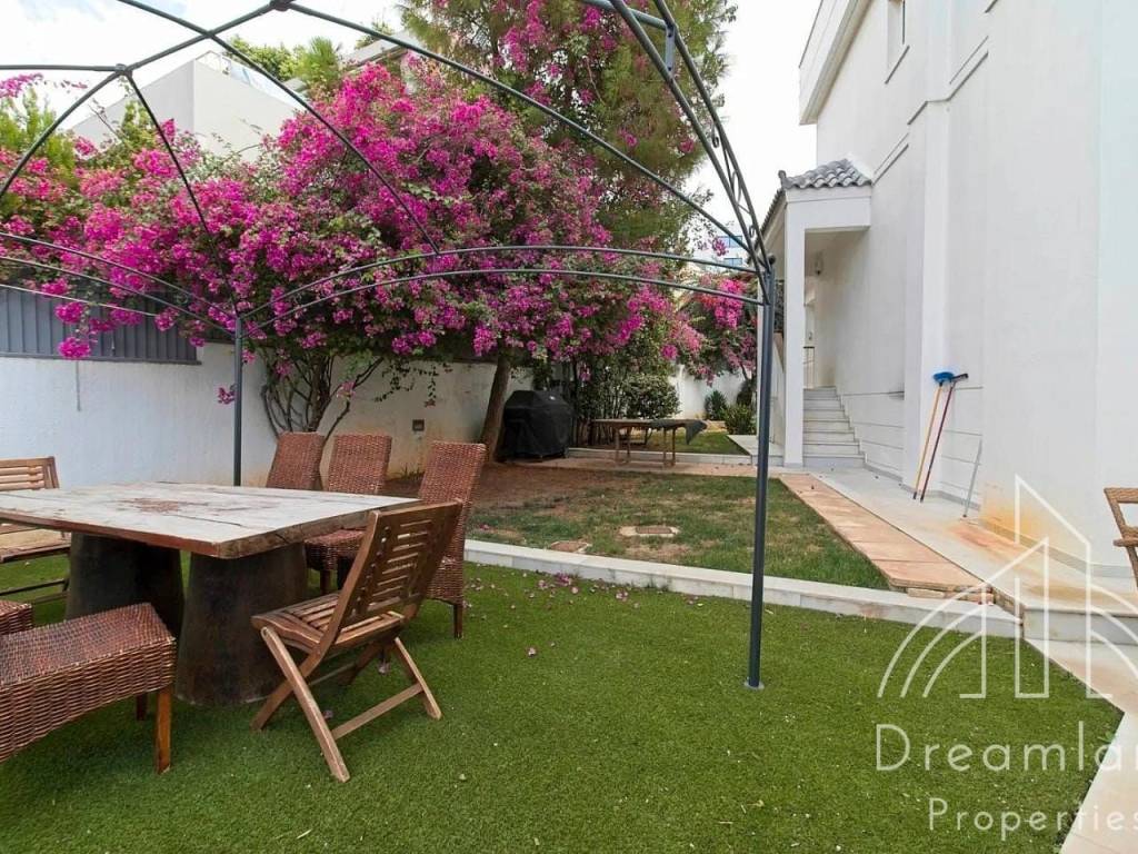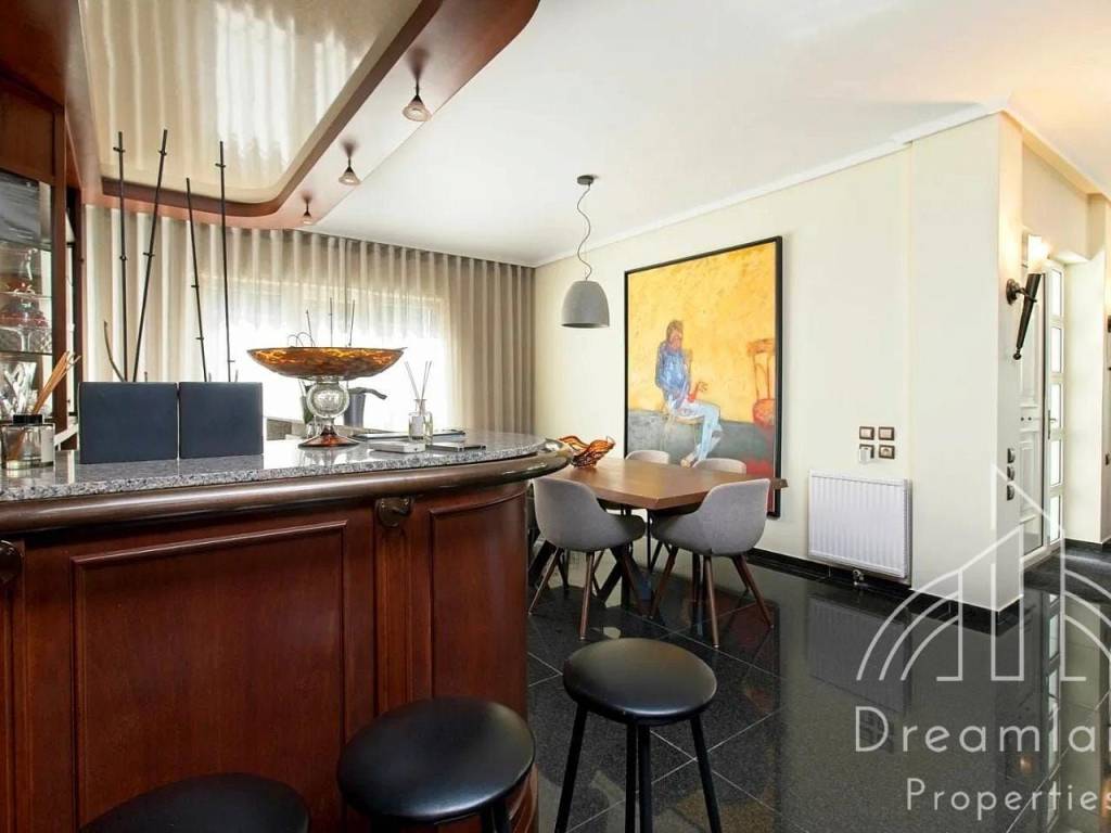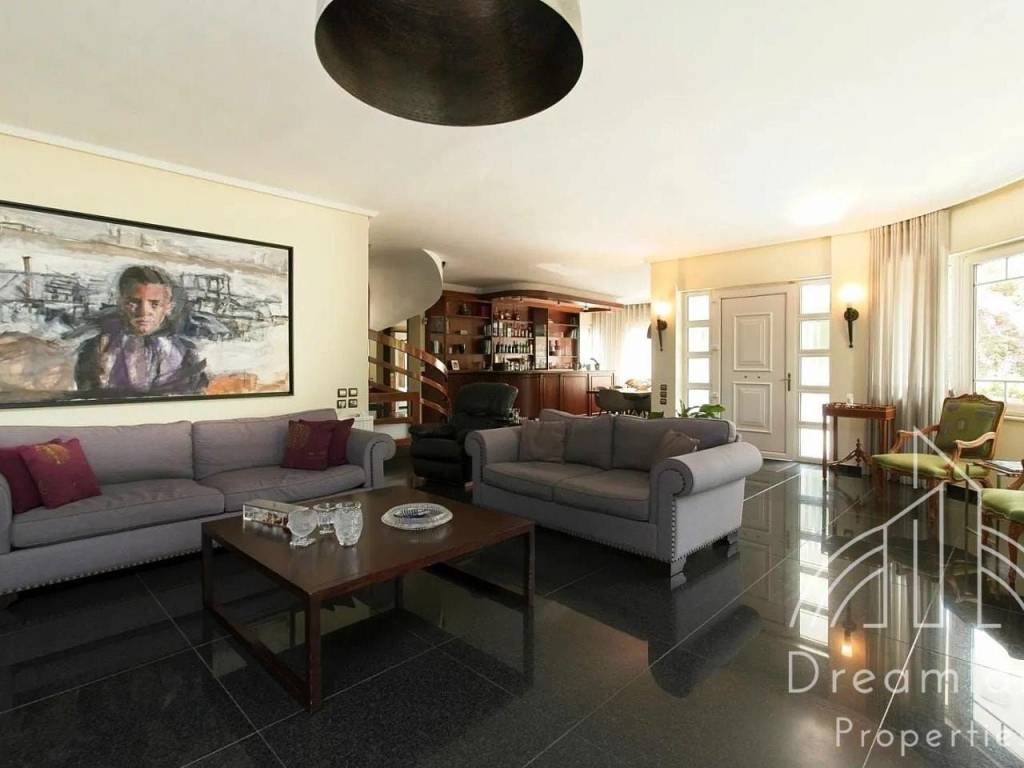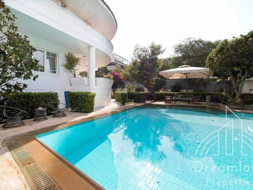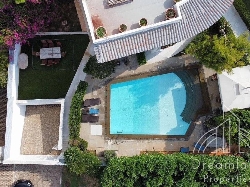 GLYFADA Golf, Luxurious Detached House 410 sq.m., Basement - 1st Floor, In a 1.100 sq.m. Plot, 6 Bedrooms (1 Master), Comfortable Living Room With Fireplace, Dining Room And Bar Area, Separate Kitchen With Built-in Appliances, 4 Bathrooms, W.C., Laundry and Ironing Room, Very Large Swimming Pool, Underground Parking, Green Landscaped Garden with Lawn, Flowers, Trees and Palm Trees, Autonomous Heating with Natural Gas, A/Cs, Security Alarm, Hot Tub, Renovated in 2021, Unique Property, It Can Be Provided Fully Furnished in Different Price, Price 11.000 Euros (Listing code: 4055).