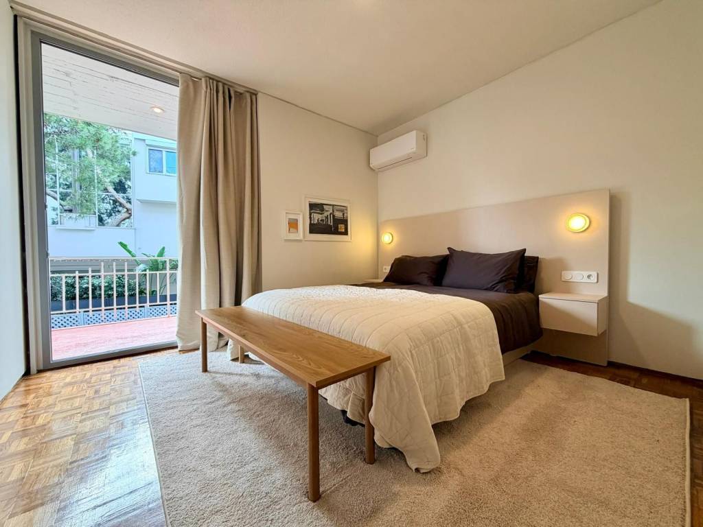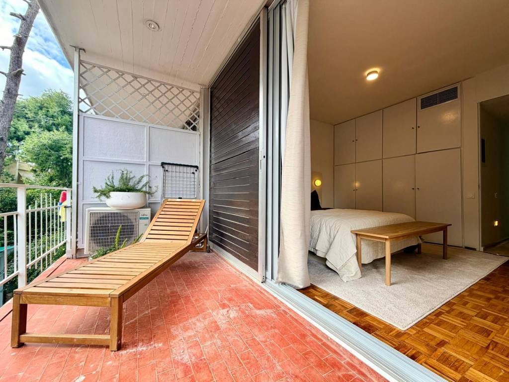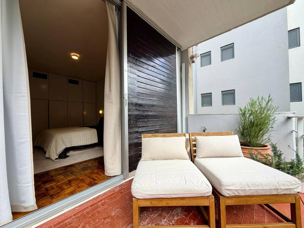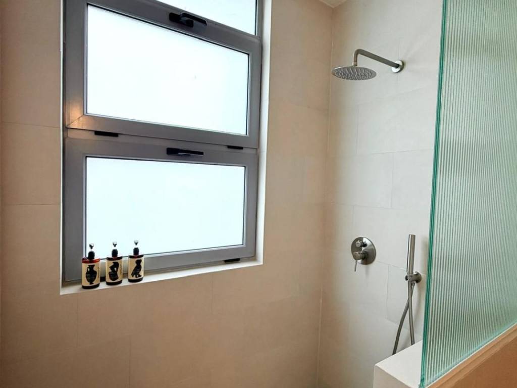 The apartment opens into a spacious dining area shared with a relaxed living room, framed by floor-to-ceiling openings that lead out to the front balcony. A fully equipped kitchen sits at the center of the apartment, perfect for preparing anything from quick snacks to casual meals. Both bedrooms are located at the back and feature queen-sized, 7-layer memory foam beds. They open onto a quiet rear balcony with lounge chairs—ideal for peaceful morning coffees as the sun rises. The bathroom offers a spacious walk-in shower and an oversized window that fills the space with natural light. Overall, the apartment is bright, airy, and surrounded by greenery.