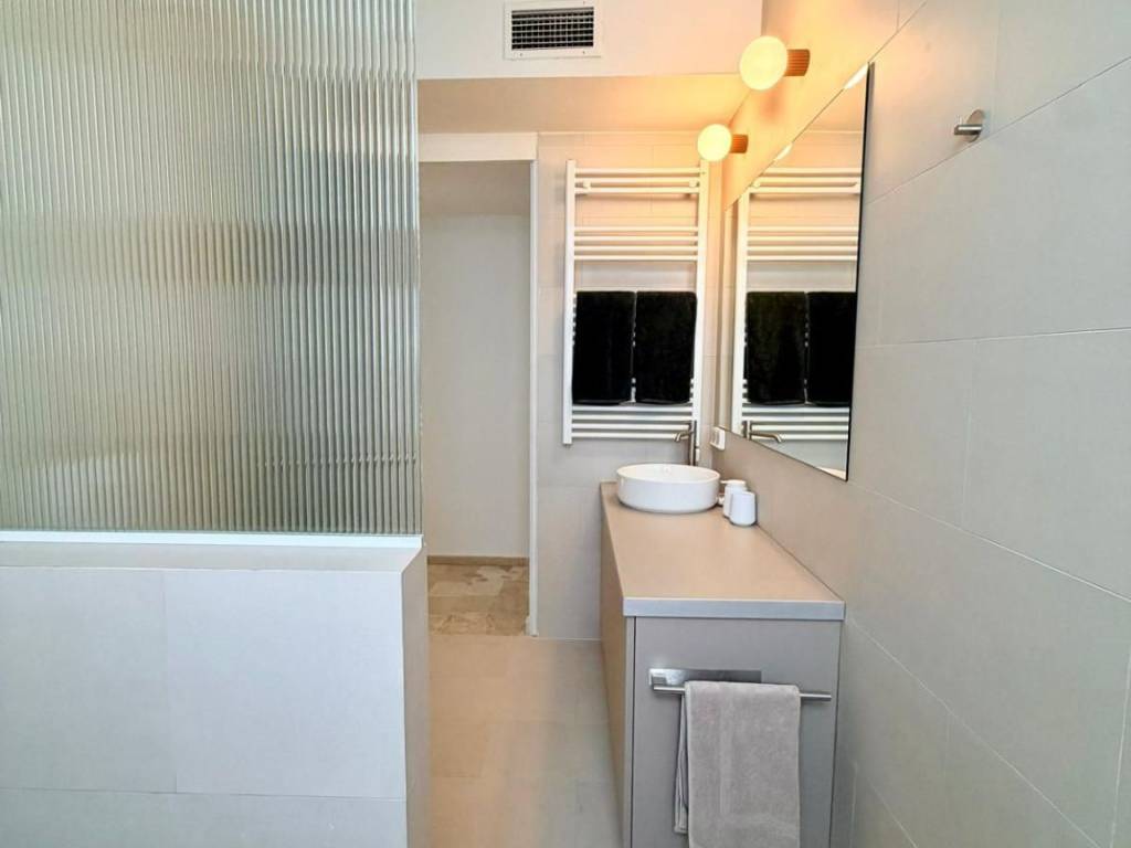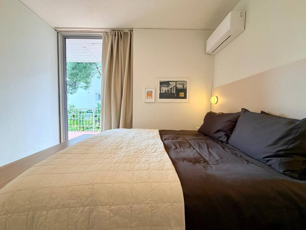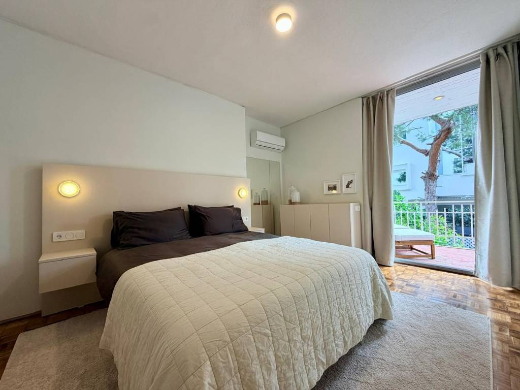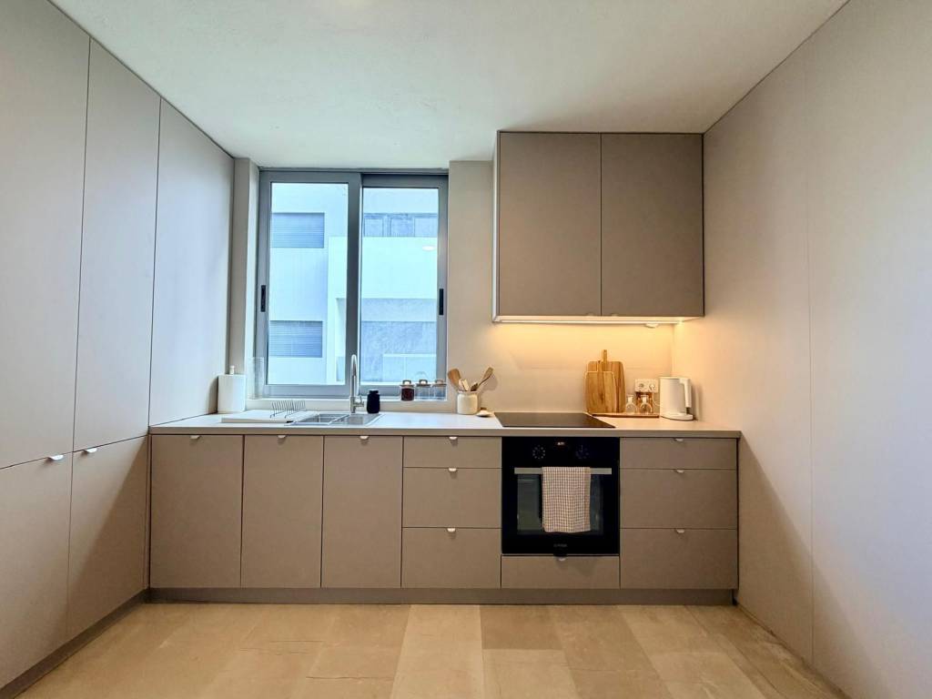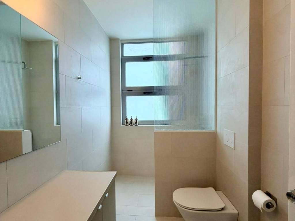 The apartment opens into a spacious dining area shared with a relaxed living room, framed by floor-to-ceiling openings that lead out to the front balcony. A fully equipped kitchen sits at the center of the apartment, perfect for preparing anything from quick snacks to casual meals. Both bedrooms are located at the back and feature queen-sized, 7-layer memory foam beds. They open onto a quiet rear balcony with lounge chairs—ideal for peaceful morning coffees as the sun rises. The bathroom offers a spacious walk-in shower and an oversized window that fills the space with natural light. Overall, the apartment is bright, airy, and surrounded by greenery.