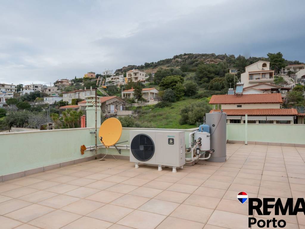 In Porto Rafti, a corner front-facing maisonette of 158 sq.m. is available for sale, located on the 2nd floor of a three-residence building constructed in 2004, combining comfort, privacy, and impressive views. The residence is exceptionally bright, featuring large perimeter balconies that embrace the space and offer an open horizon. It also provides exclusive use of the rooftop, where one can enjoy unobstructed views in every direction as well as beautiful sea views, creating an ideal setting for relaxation and entertaining. On the rooftop there is also a 16 sq.m. attic that can be utilized as a guest room, office, or leisure area. The interior layout includes two spacious bedrooms, two luxurious marble-clad bathrooms, a modern fully equipped kitchen with electrical appliances, and a comfortable, particularly bright living room with wooden floors and a fireplace that offers a warm and elegant atmosphere during the winter months. The property is offered unfurnished and is ready for immediate occupancy. It features aluminum window frames with double glazing for thermal and sound insulation, autonomous heating with a heat pump, and air-conditioning units in the bedrooms and living room, ensuring comfort throughout the year. Additional features include a security door, video intercom, and one parking space in the shared courtyard of the building. It is an excellent choice either for owner-occupation or as a quality holiday home near the sea, as well as for investment purposes with significant return potential. Authorized Listing Agent, TONIA ALLAGIANNI   / REAL ESTATE AGENT. Registry No. (G.E.MH): 160259603000. Member of the Athens - Attica Realtors Association. Availability for showing by arrangement.