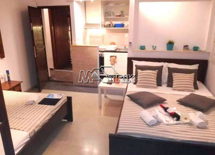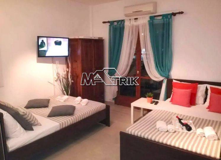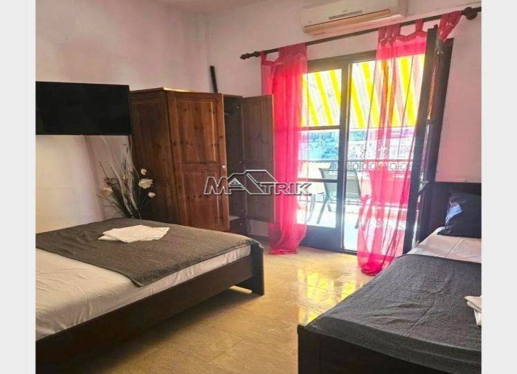Chalkidiki, Pefkochori, 52sqm apartment in the heart of the village. It consists of one bedroom, living room -kitchen and one bathroom. It has wooden window frames, marble and tiled floor, one a/c, a large corner balcony with awnings on each side, as well as it is fully furnished and equipped with all electrical appliances. The apartment can accommodate up to 8 people, it is extremely bright, it is located in the heart of the village and its distance from the sea is 200m. It is an excellent choice both for a holiday house and for tourist developmnet with a great return on capital.