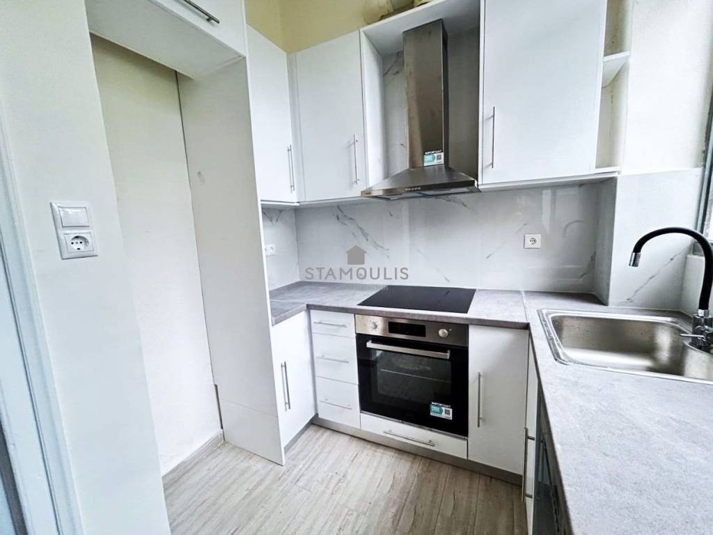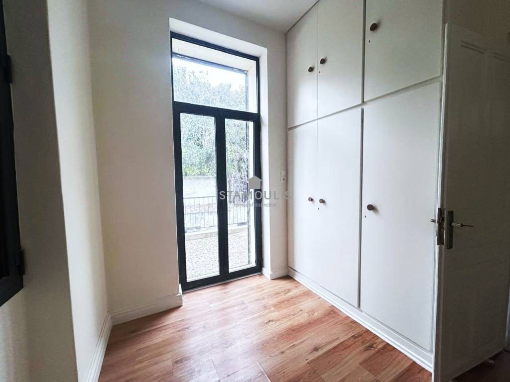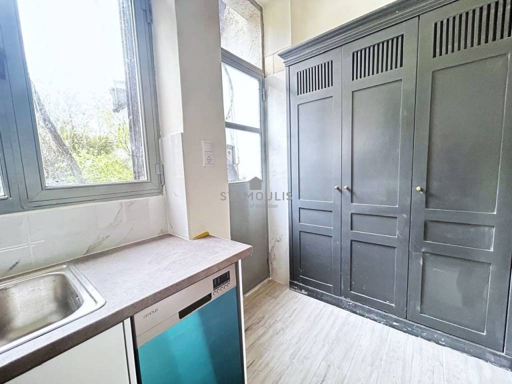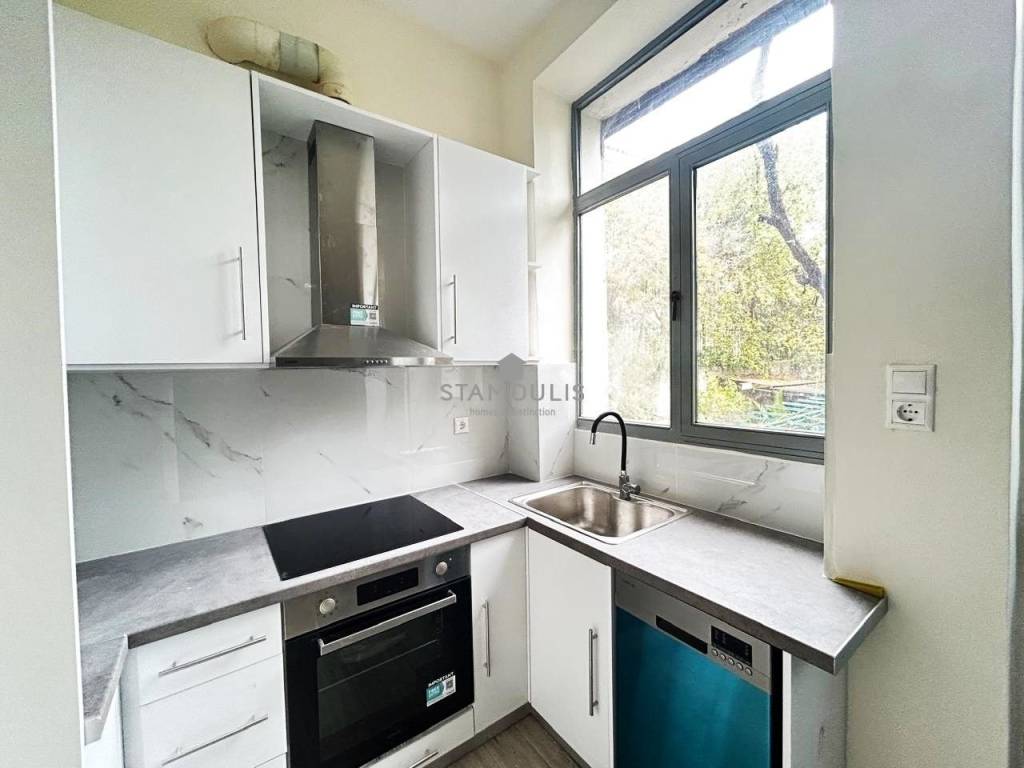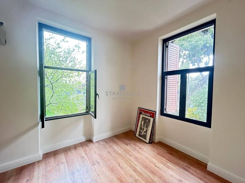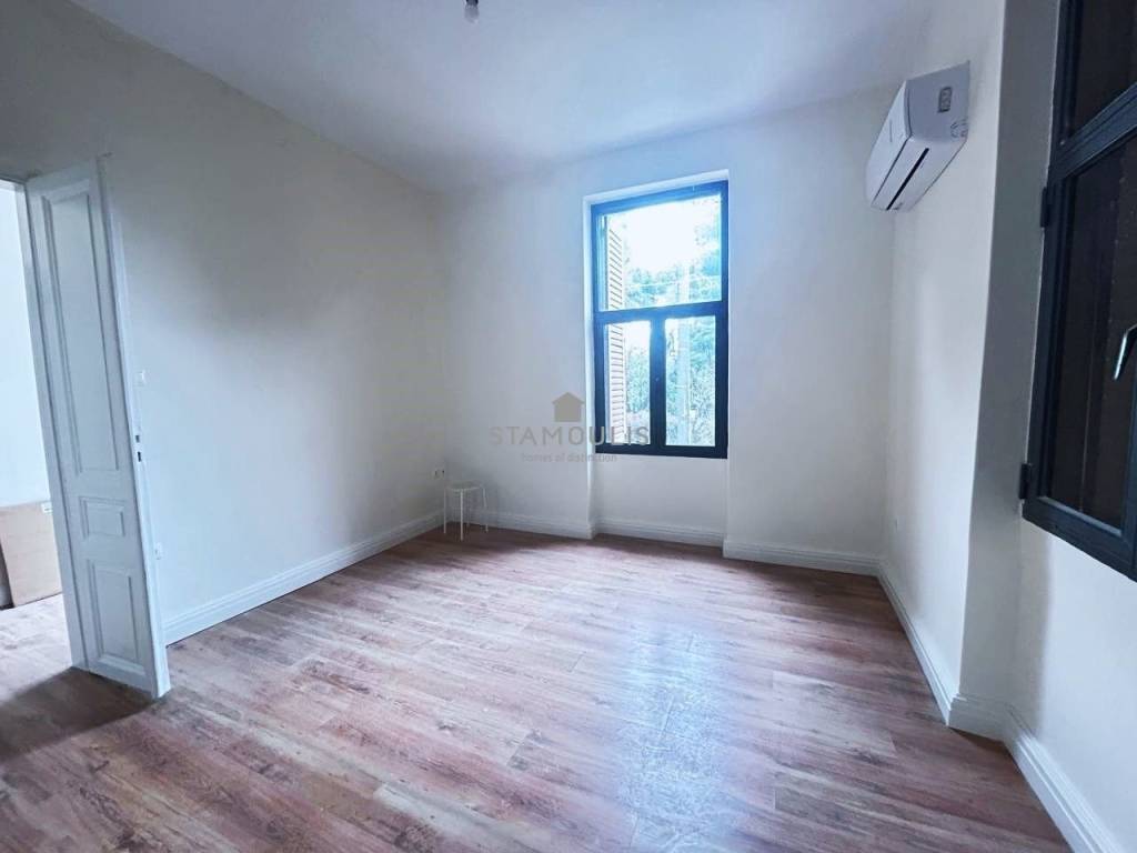 Fully renovated apartment 72 sq.m, on the 1st floor of a stone duplex in excellent location in Strofyli, with direct access to shops and public transportation. It has 2 bedrooms, bathroom, bright reception area, kitchen equipped with built-in appliances, wood striped floors, aluminum windows, air condition, security door, common garden and 1 open parking space.