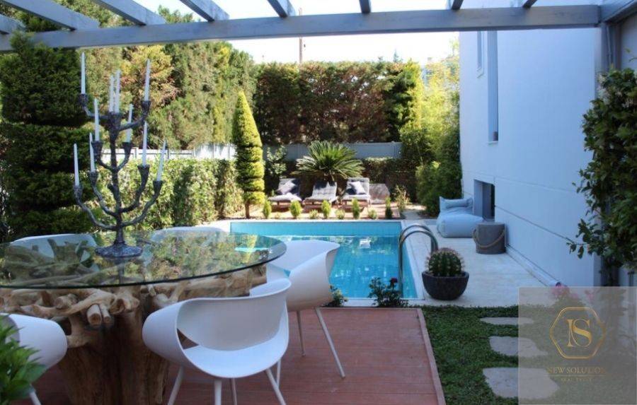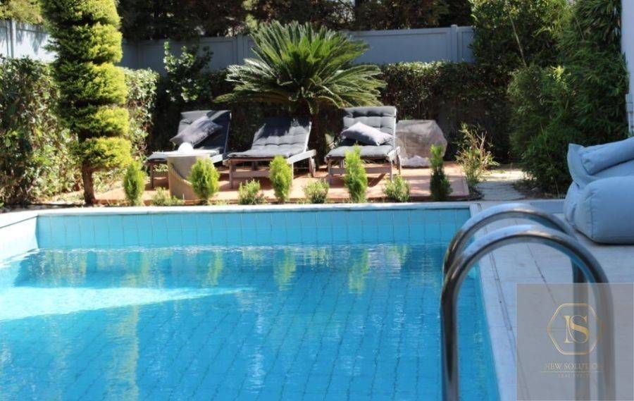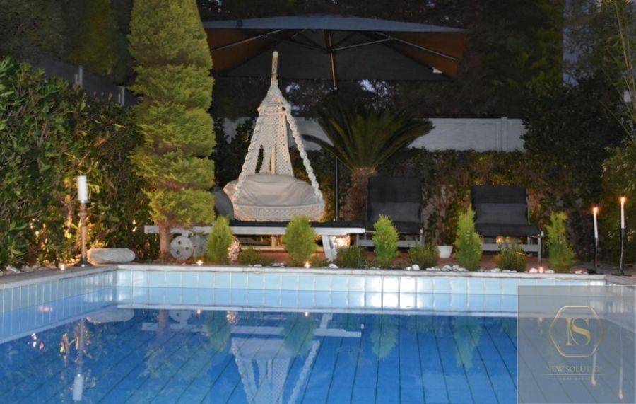 Glyfada, Golf, Detached house For Rent, 270 sq.m., In Plot 600 sq.m., Property Status: Amazing, Floor: Ground floor, 4 Level(s), 5 Bedrooms 1 Kitchen(s), 2 Bathroom(s), 1 WC, Heating: Autonomous - Petrol, View: Good, Building Year: 2002, Energy Certificate: C, 1 parking(s), Floor type: Wooden floors, Type of door frames: Aluminum, Features: Elevator, Security door, Security alarm, Storage room, Fireplace, Night stream, Playroom, Internal Staircase, Double Glazed Windows, Balconies, BBQ, Pets Allowed, Furnished, Airy, Roadside, Bright, AirConditioning, Solar water system, Swimming pool, Back yard (Garden), Renovated, Price: 7.500€. NEW SOLUTION REAL ESTATE, Tel: (+30) 210 9680099-(6944848414), email: info@newsolution.gr