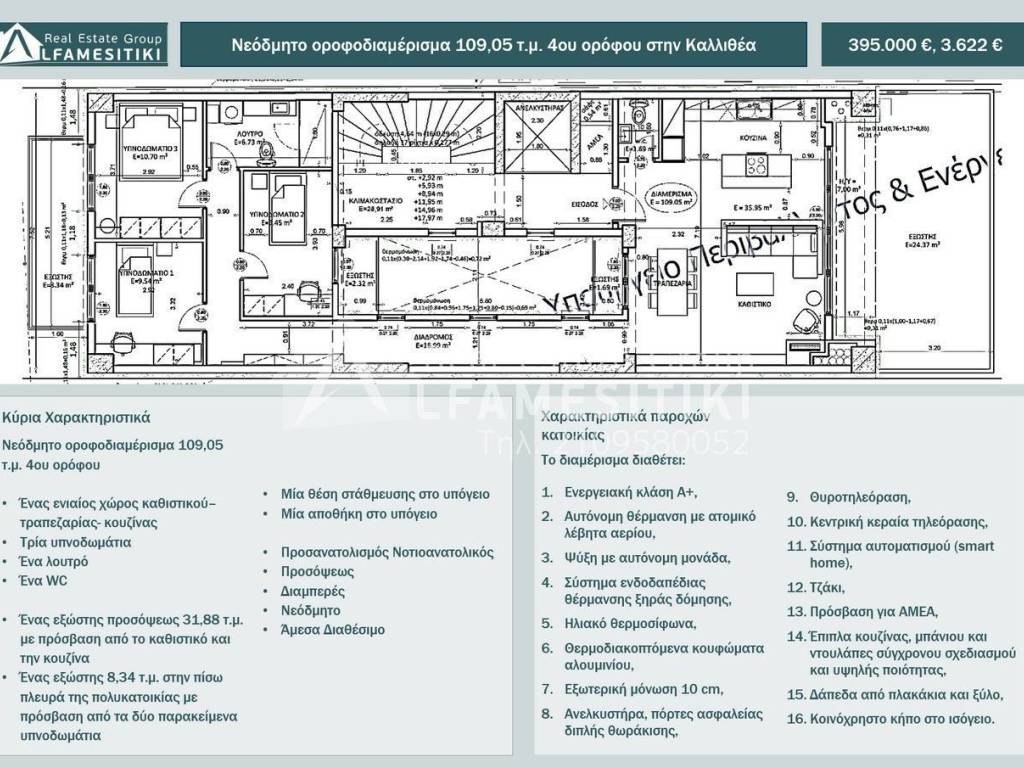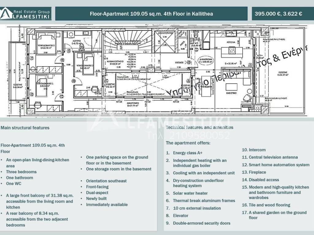 For sale: newly constructed floor-apartment, 109.05 sq.m., on the 4th floor of a luxurious eight-story residential building in Kallithea. Space Layout The apartment is front-facing, dual-aspect, airy, and sunny, with a southeast orientation. It includes a particularly spacious open-plan living-dining-kitchen area, three bedrooms, one bathroom, one WC, a large front balcony of 31.38 sq.m. accessible from the living room and kitchen, a rear balcony of 8.34 sq.m. accessible from the two adjacent bedrooms, one parking space, and one storage room in the basement. Technical features and amenities The apartment offers: energy class A+, independent heating with an individual gas boiler, cooling with an independent unit, dry-construction underfloor heating system, solar water heater, thermal break aluminum frames, 10 cm external insulation, elevator, double-armored security doors, intercom, central television antenna, smart home automation system, fireplace, disabled access, modern and high-quality kitchen and bathroom furniture and wardrobes, tile and wood flooring, and a shared garden on the ground floor. The construction is luxurious and aesthetically pleasing both externally and internally. It is characterized by its minimalist design, with attention to achieving optimal space utilization, functionality, views, and orientation. Location The residence is located in a quiet area in the center of Kallithea, offering an ideal location that combines the tranquility of home life with proximity to the vibrant city center, access to major roads, and public transportation, making it an ideal choice for families and active individuals alike. ► For more details about the property, the building or the area as well as to visit the property you can visit the page - https://www.alfamesitiki.gr/pdetails?id=Α-146239&lng=en ► For opportunities in similar properties and in other areas visit our page at alfamesitiki.gr ► Last update 25/3/2026 ► Follow us on Facebook www.facebook.com/alfamesitiki.gr