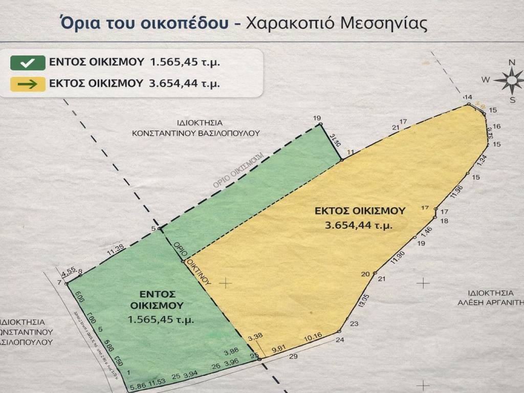 ΠΩΛΕΙΤΑΙ Επενδυτικό Οικόπεδο 5.219 τ.μ. Στο Χαρακοπιό στην Κορώνη Μεσσηνίας – Με Τμήμα Εντός Οικισμού & Δόμηση. Πωλείται προνομιακό γεωτεμάχιο συνολικής επιφάνειας 5.219,89 τ.μ. σε εξαιρετική τοποθεσία στο Χαρακοπιό, στη θέση Κασέλα, πολύ κοντά στην ιστορική Κορώνη Μεσσηνίας. Το ακίνητο αποτελεί εξαιρετική επενδυτική ευκαιρία, συνδυάζοντας δυνατότητα δόμησης και αγροτική εκμετάλλευση, καθώς διαθέτει. ΤΜΗΜΑ ΕΝΤΟΣ ΟΙΚΙΣΜΟΥ Επιφάνεια: 1.565,45 τ.μ. Οικοδομήσιμο Δυνατότητα δόμησης έως 400 τ.μ. Δυνατότητα κατασκευής: Κατοικία έως 400 τ.μ. Μέγιστο ύψος ~7,5 μ. + στέγη Έως 2 όροφοι . ΤΜΗΜΑ ΕΚΤΟΣ ΟΙΚΙΣΜΟΥ Επιφάνεια: 3.654,44 τ.μ. Διαμορφωμένο ως ελαιώνας . Περιλαμβάνει περίπου 100 ρίζες ελιές . Κατάλληλο για αγροτική χρήση ή επέκταση κατοικίας . ΤΟΠΟΘΕΣΙΑ Μόλις 1,7 km από τη θάλασσα . Πρόσοψη σε δημοτικό δρόμο , Λίγα λεπτά από το κέντρο της Κορώνης . Κοντά σε παραλίες και τουριστικές περιοχές της Μεσσηνίας . Ήσυχη, φυσική και προνομιακή περιοχή . ΙΔΑΝΙΚΟ ΓΙΑ . Κύρια κατοικία - Εξοχική κατοικία - Κατασκευή βιλών - Τουριστική εκμετάλλευση - Επενδυτικό project . ΧΑΡΑΚΤΗΡΙΣΤΙΚΑ Συνολική επιφάνεια. 5.219,89 τ.μ. Εντός οικισμού: 1.565 τ.μ. Δόμηση: έως 400 τ.μ. Ελαιώνας με 100 ελαιόδεντρα Πρόσβαση από δρόμο , Εξαιρετικός συνδυασμός κατοικίας & επένδυσης . Ένα μοναδικό ακίνητο που συνδυάζει οικιστική αξία, επενδυτική προοπτική και φυσικό περιβάλλον, σε μία από τις πιο ανερχόμενες περιοχές της Μεσσηνίας. Ιδανικό για όσους αναζητούν άμεση αξιοποίηση ή μακροπρόθεσμη επένδυση