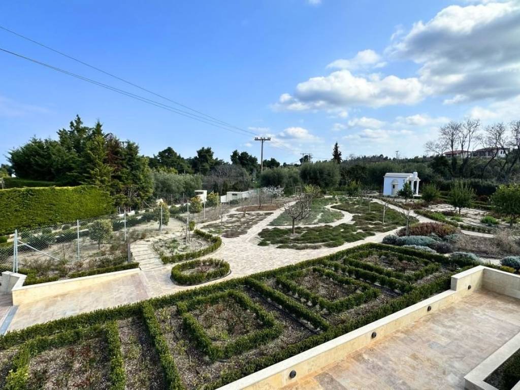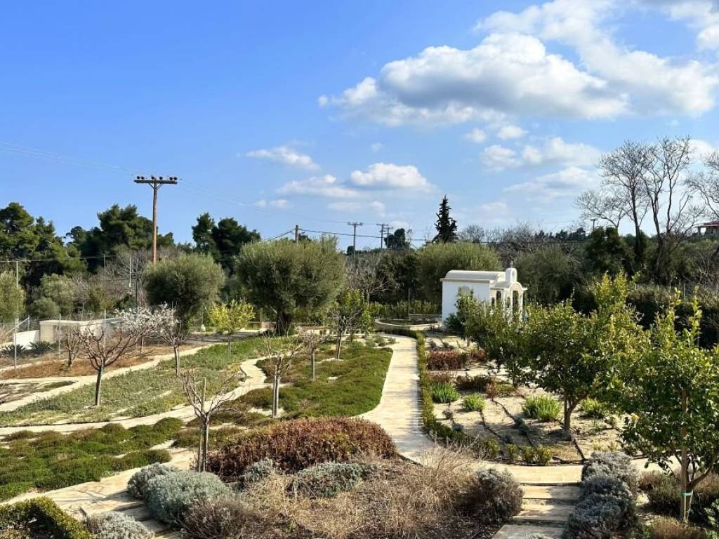 The total plot area is 3,890 m² (2,100 + 1,790 m²). The entire area is landscaped and completely paved with stone. The property features olive and fruit trees, a well-maintained garden with an automatic irrigation system, a fire pit, a barbecue with a sink, and garden furniture. A small chapel on the property adds a special ambiance.