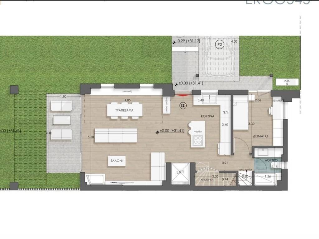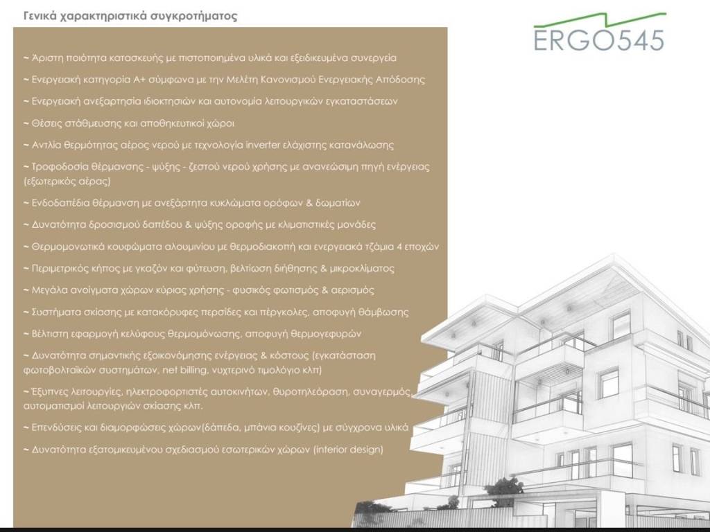 General Features of the Complex Excellent construction quality with certified materials and specialized crews Energy class A+ in accordance with the Energy Performance Regulation study Energy independence of residences and autonomy of building systems Parking spaces and storage areas Air-to-water heat pump with inverter technology for minimal energy consumption Heating, cooling, and domestic hot water supplied via a renewable energy source (ambient air) Underfloor heating with independent circuits per floor and per room Option for floor cooling and ceiling cooling using air-conditioning units Thermally insulated aluminum frames with thermal break and 4-season energy-efficient glazing Perimeter garden with lawn and planting, improving drainage and microclimate Large openings in main living areas for natural light and ventilation Shading systems with vertical louvers and pergolas to reduce glare Optimized thermal insulation envelope to prevent thermal bridges Potential for significant energy and cost savings (photovoltaic systems, net billing, night tariff, etc.) Smart features: EV charging points, video intercom, alarm system, automated shading systems, etc. Upgrade options and customization of spaces (flooring, bathrooms, kitchens) with modern materials Option for personalized interior design (interior design)