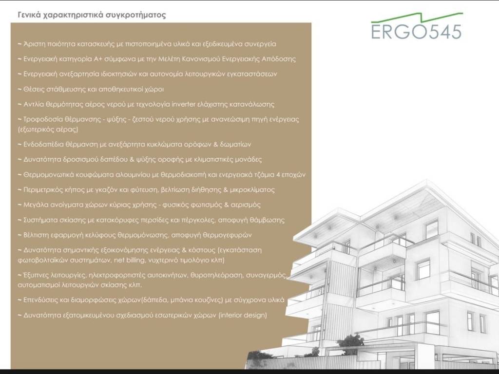 General Characteristics of the Complex Excellent construction quality with certified materials and specialized contractors Energy class A+ according to the Energy Performance Regulation Study Energy independence of residences and autonomy of operational installations Parking spaces and storage areas Air-to-water heat pump with inverter technology for minimal consumption Supply of heating – cooling – domestic hot water using a renewable energy source (ambient air) Underfloor heating with independent circuits per floor & room Capability for floor cooling & ceiling cooling with air conditioning units Thermal insulation aluminum frames with thermal break and energy-efficient four-season glazing Perimeter garden with lawn and planting, improving drainage & microclimate Large openings in main living areas – natural lighting & ventilation Shading systems with vertical louvers and pergolas, avoiding glare Optimal application of building envelope insulation, avoiding thermal bridges Potential for significant energy and cost savings (installation of photovoltaic systems, net billing, night tariff, etc.) “Smart” features: electric vehicle charging, video intercom, alarm systems, automation of shading systems, etc. High-quality finishes and layouts (floors, bathrooms, kitchens) with modern materials Option for customized interior design of spaces