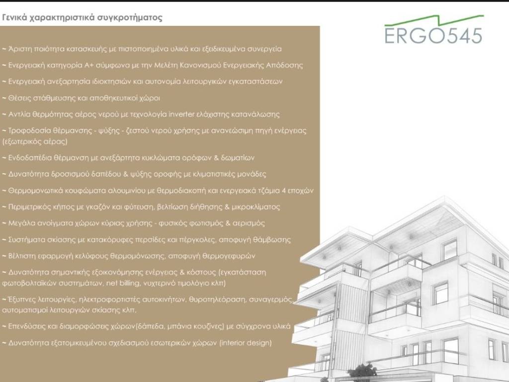General Features of the Complex Excellent construction quality with certified materials and specialized crews Energy class A+ according to the Energy Performance Regulation study Energy independence of properties and autonomy of operational installations Parking spaces and storage areas Air-to-water heat pump with inverter technology for minimal consumption Supply of heating – cooling – domestic hot water using renewable energy source (outdoor air) Underfloor heating with independent circuits per floor & room Possibility of floor cooling & ceiling cooling with air-conditioning units Thermally insulated aluminum frames with thermal break and 4-season energy glazing Perimeter garden with lawn and planting, improving drainage & microclimate Large openings in main living areas – natural lighting & ventilation Shading systems with vertical louvers and pergolas to prevent glare Optimal application of thermal insulation envelope, avoiding thermal bridges Potential for significant energy & cost savings (installation of photovoltaic systems, net billing, night tariff, etc.) Smart features: EV chargers, video door entry, alarm system, automation of shading systems, etc. Upgrade options and customization of spaces (floors, bathrooms, kitchens) with modern materials Possibility of customized interior design (interior design)