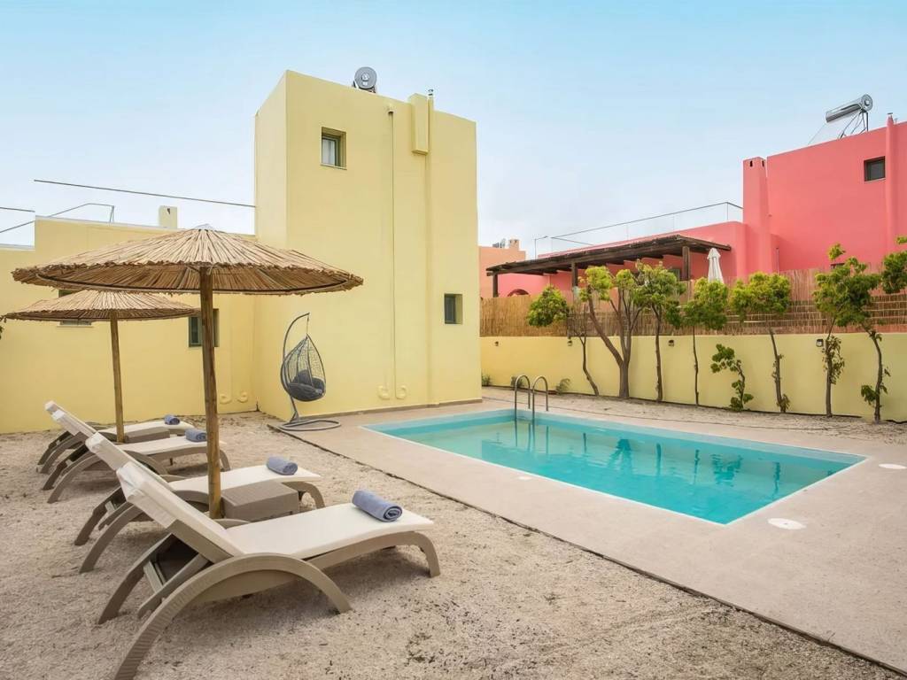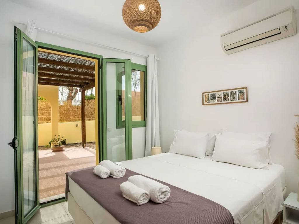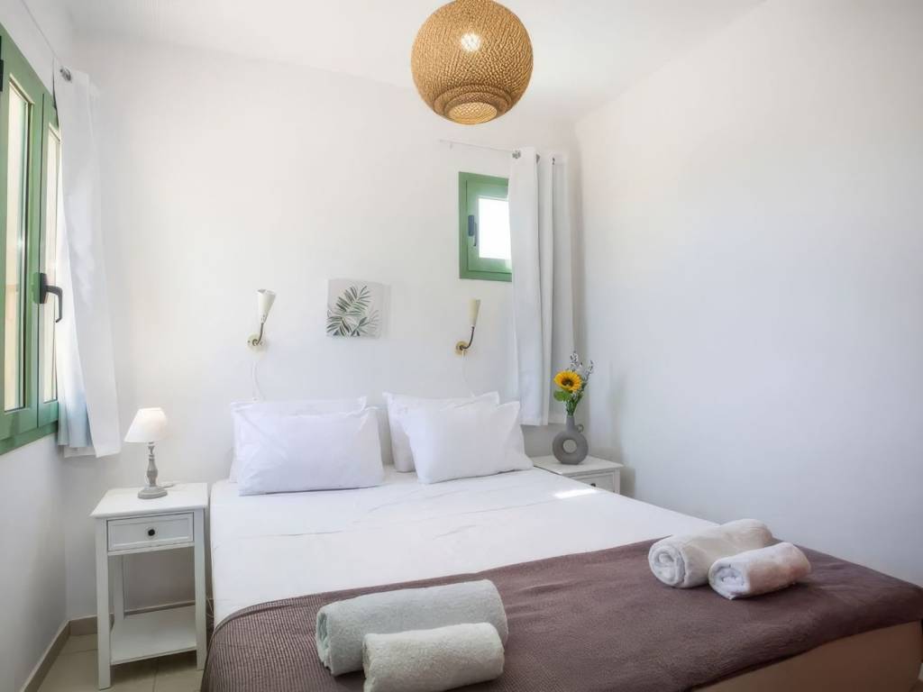 The 78 sqm villa rests on a fenced 348 sqm plot and unfolds over two floors. The ground floor features an inviting living/dining room and open-plan kitchen, as well as a bedroom with direct access to the outdoor area and a bathroom. A flight of stairs leads to the first floor, which houses the second bedroom and a bathroom. The bedroom has access to a spacious balcony offering nice sea views.Life flows naturally outdoors, where a private swimming pool and sundeck invite long, sun-soaked days, and a covered terrace creates the perfect setting for outdoor seating or al-fresco dining under the Aegean sky. Whether enjoying a leisurely lunch, a sunset drink or a refreshing swim, the outdoor spaces are designed to be lived in and enjoyed.