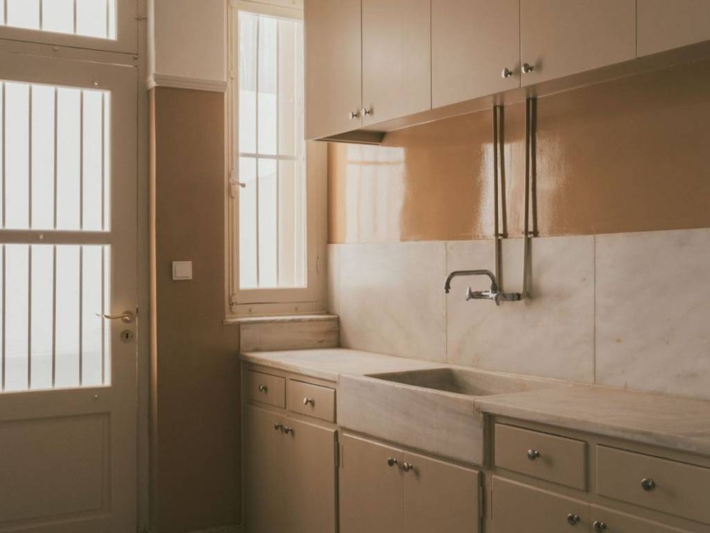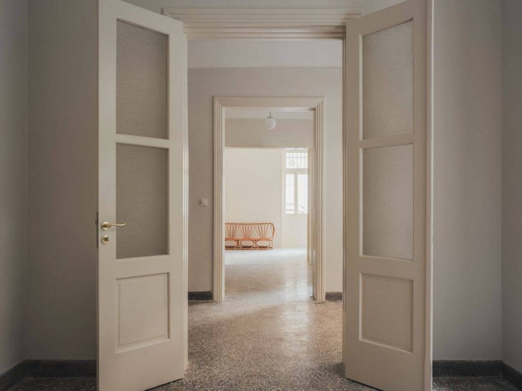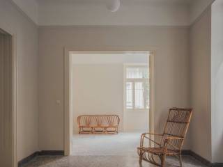 THE SPACE The apartment has its own separate entrance from the street and a beautiful, big hallway around which are a series of rooms that could be used flexibly for living or working. There is built-in storage, a bathroom with a bathtub, and a small patio at the back. THE MATERIALS The original marble finishes, terrazzo floors, art-deco metal doors and timber-framed windows with louvred shutters have been carefully restored. The apartment has been built with textural materials using traditional craftsmanship and respected local tradespeople. THE BUILDING Sikinou Patio Apartment is on the ground floor of an interwar- style building in Kypseli, recently refurbished in collaboration with London-based architects Royffe Flynn. The ground floor was built in 1922 for a couple as their first home, with the first floor added in 1940 and the second floor in 1960 for their family. It is one of four apartments in the building, with shared access to a rooftop terrace and laundry. THE NEIGHBOURHOOD The apartment is in lively Athenian neighbourhood of Kypseli, around the corner from Kypseli’s busy and lovely tree-lined pedestrian square, Fokionos Negri, occupied by small cafés, restaurants, bars and shops. It is a 10-minute walk from Agiou Georgiou Square, well-known for its tavernas and local bars, and one of Athens’s largest public parks, Pedion tou Areos. The weekly farmers market happens on Sikinou every Tuesday, where you can find locally grown fruit and vegetables and homemade sweets.
