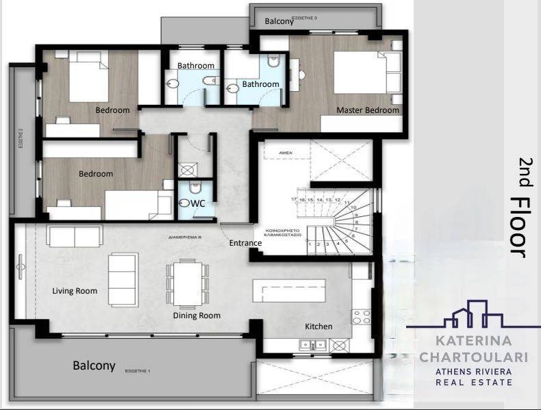 Apartment For sale, floor: 2nd, in Voula. The Apartment is 120 sq.m.. It consists of: 3 bedrooms (1 Master), 2 bathrooms, 1 wc, 1 kitchens, 1 living rooms and it also has 2 parkings (1 Underground, 1 Pilotis space). The property was built in 2026. Its heating is Personal with Heat pump, Underfloor heating are also available, it has Alluminum frames, the energy certificate is: A+ and its floors are Tiles, Wooden. The property's status is: New development, it is close to Park, Sea, 700 Km from sea, Luxury and it also has the following unique features and advantages: Window Screens, Storage, Security door, CCTV, Security alarm. Price: €1.000.000. Katerina Chartoulari Real Estate, contact phone: 2108976105, email: info@chartoulari.gr, website: www.chartoulari.gr
