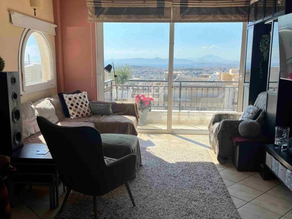 In the prime area of Upper Argyroupoli, a stunning 3rd-floor apartment is offered for sale, combining comfort, elegance, and breathtaking views. The property is dual-aspect, filled with natural light, and enjoys unobstructed panoramic views of both the sea and the mountains. The spacious open-plan living room and kitchen feature a fireplace and open onto large verandas (85 sqr.m), creating an ideal setting for relaxation and entertaining against a backdrop of endless blue. The two comfortable bedrooms offer tranquility and beautiful mountain views, while the apartment is completed by a stylish bathroom. Expansive verandas and surrounding balconies enhance the sense of openness and privacy. Additional features include autonomous heating, a solar water heater, a storage room, and two parking spaces in the pilotis, fully meeting the needs of modern living. An excellent choice for those seeking a high quality of life in a quiet yet privileged location, with easy access to both the city and the sea.
