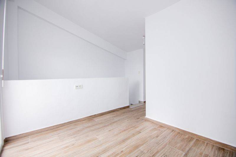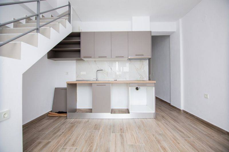 The first level consists of a living room with kitchen area and balcony, one bedroom, and a bathroom. An internal staircase leads to the upper level, which includes one additional bedroom, a bathroom, and a balcony.