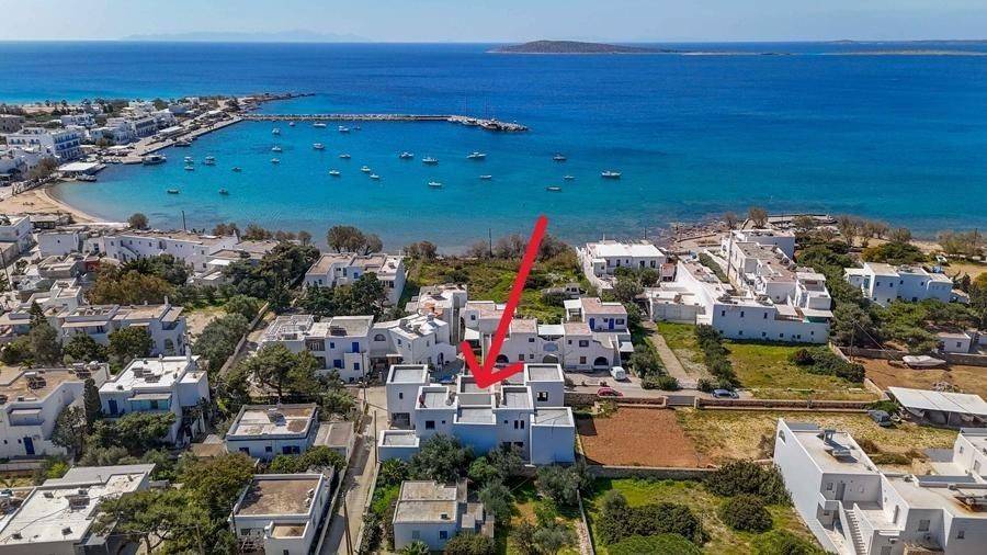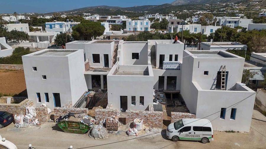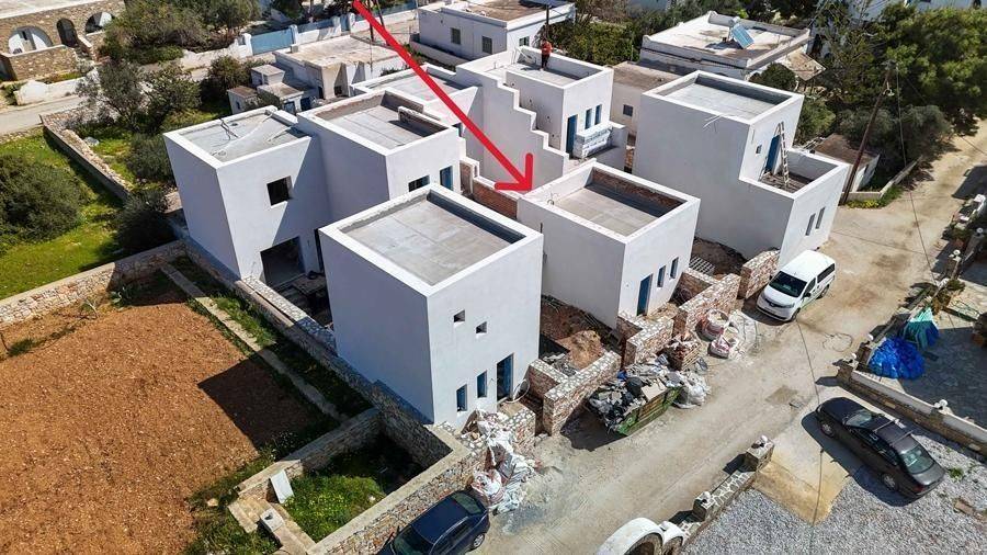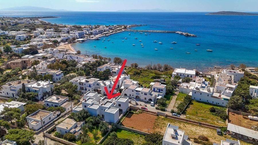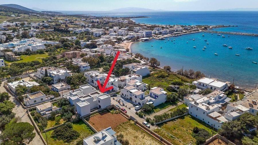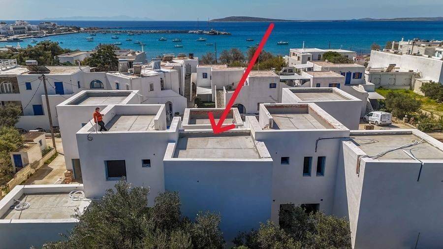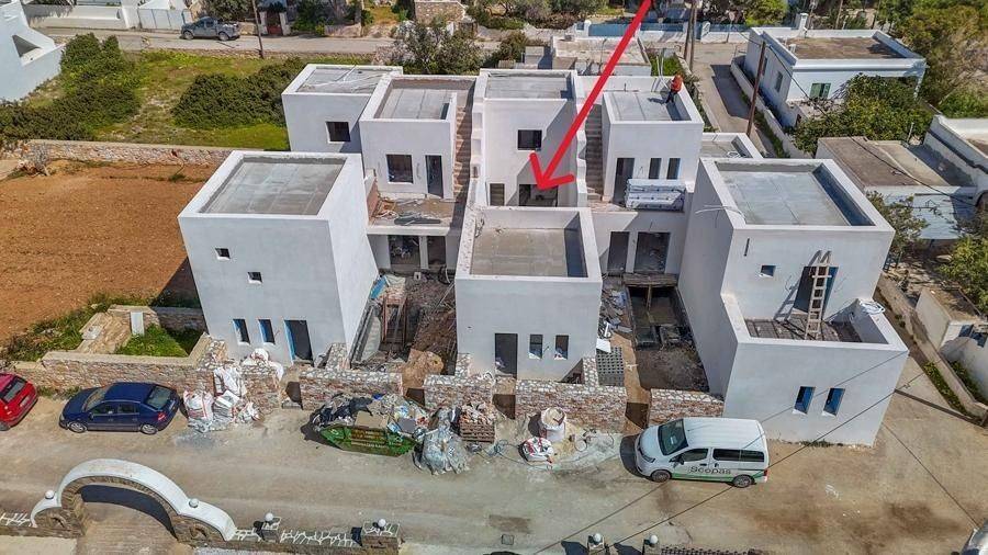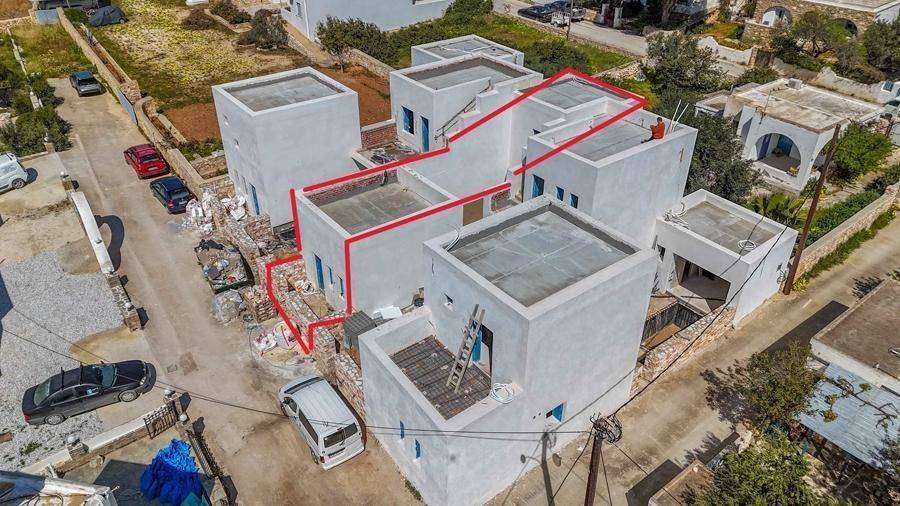 House for sale in southern Paros, in Alyki. Corner residence of 82m2, in a complex under construction, on a plot of 100m2. It has 2 bedrooms, 2 bathrooms, a WC, a kitchen, a living room, and a patio with a splash pool. It also has heating, air conditioning, double-glazed windows with flyscreens, a fireplace, verandahs, a security door, and a BBQ. Just a few meters from the sea and the picturesque harbor of Alyki, is an ideal choice for a holiday home or rental investment. Western orientation with street views. All networks are connected. Access by paved road. 13 km from the port of Parikia. 4 km from the airport.