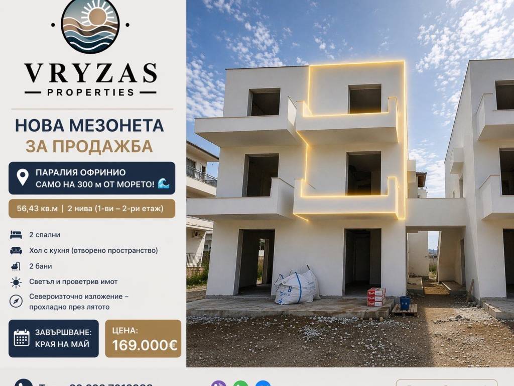 НОВА МЕЗОНЕТА ЗА ПРОДАЖБА В ПАРАЛИЯ ОФРИНИУ – САМО НА 300 м ОТ МОРЕТО! В сърцето на Паралия Офриниу, модерно жилище, което съчетава комфорт и лятно усещане, идеално за ваканционен дом или инвестиция. 56,43 кв.м | 2 нива (1-ви–2-ри етаж) 2 спални Хол – кухня в отворено пространство 2 бани Преходно жилище & много светло Североизточно изложение – прохладно през цялото лято Характеристики: Подготовка за климатик Синтетични дограми Двоен стъклопакет & комарници Блиндирана врата Съвременни плочки Завършване: края на май Цена: 169.000 € VRYZAS PROPERTIES Тел: +30 693 7013988 Viber | WhatsApp | Messenger Изпратете съобщение за повече информация Запишете час за оглед