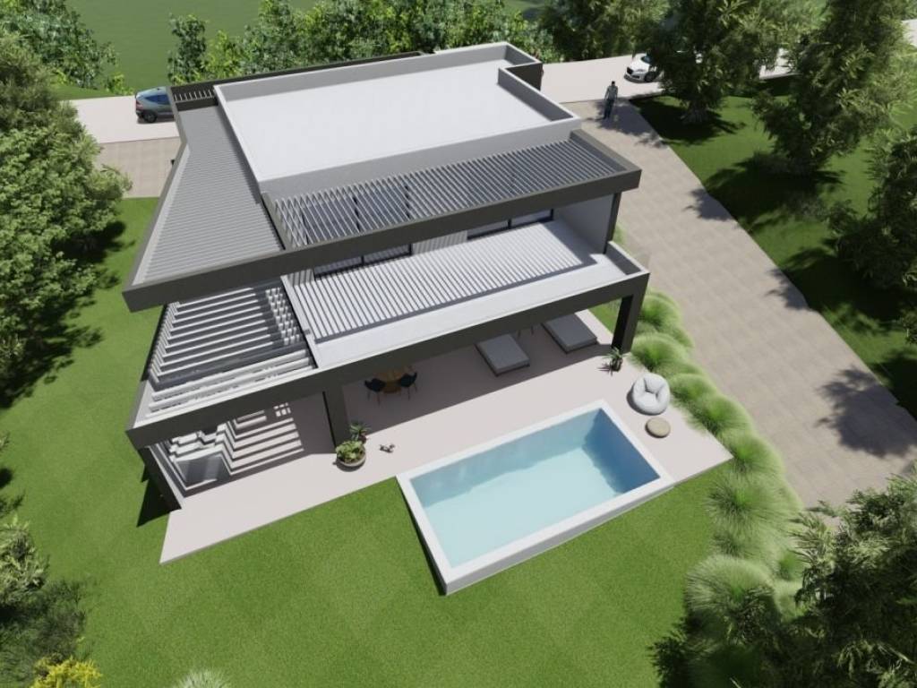 The lower level includes two bedrooms with en-suite bathrooms and a laundry room – an ideal space for guests or children with complete privacy. The ground floor features an open-plan layout: the living room, dining room, and kitchen are combined into a single, bright space with direct access to the terrace and pool. The guest toilet and the main entrance with an internal staircase are also located here. The second floor is the main living level: two spacious bedrooms with en-suite bathrooms, a spacious outdoor terrace, and a pergola overlooking the surrounding area.