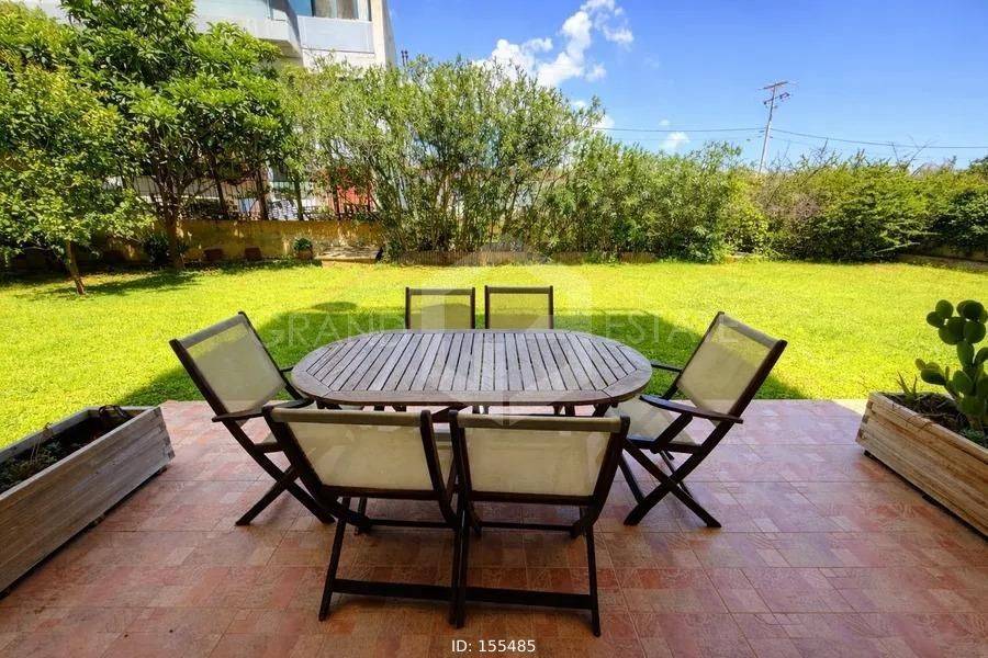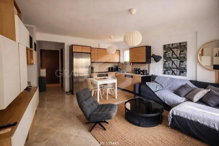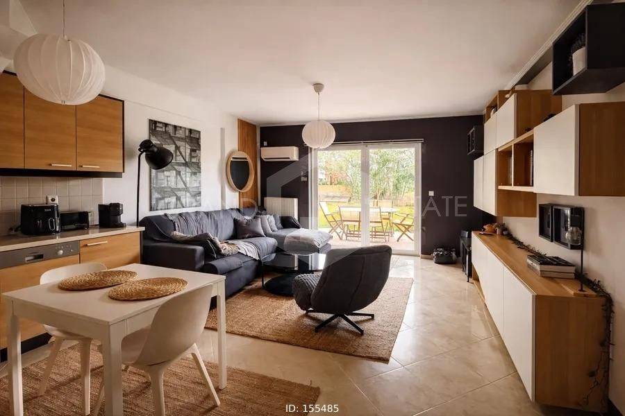 Gerakas, Centre - Apartment 51sqm fully furnished, bedroom, levels 1, ground floor, fully renovated, year built 2012, energy class A, living room, kitchen, bathroom, heating type: autonomous (oil), parking covered,2, quiet, dual aspect apartment, luminous, painted, storage space 5sqm, solar heater, balconies, elevator, garden, aluminum frames, wood & tile floors, secure door, alarm, within city plan, residential zone, northern orientation.