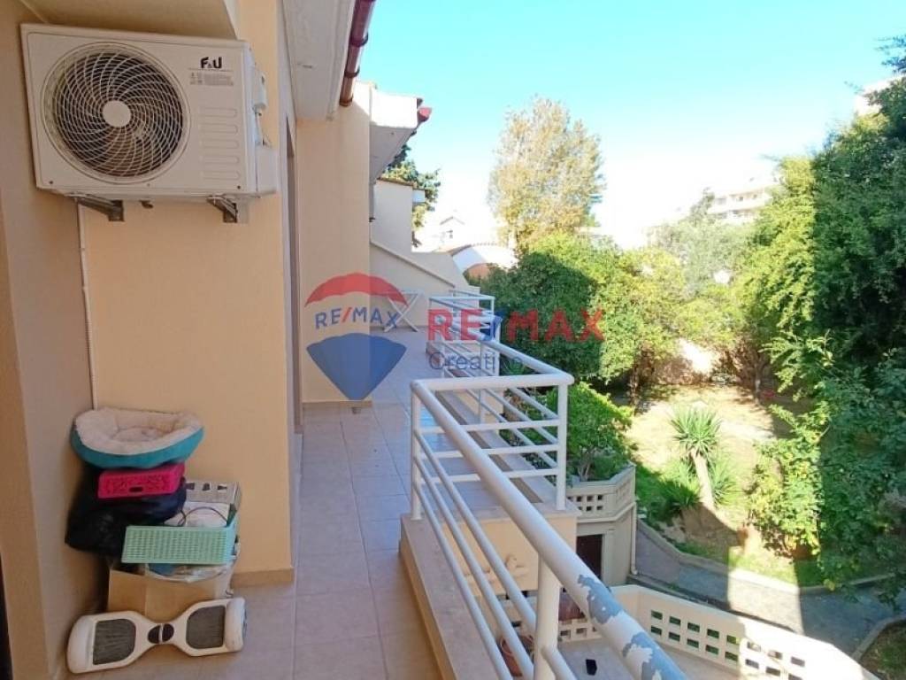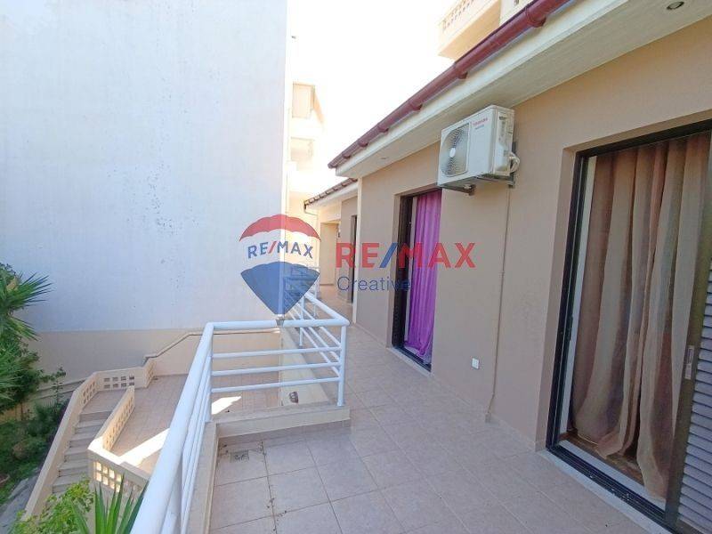 In the center of the city of Rethymno, near the hospital, a 143 sq m apartment is available for sale. It is a raised ground floor maisonette, built in 1989 and partially renovated in 2005 and 2022, which also has a covered parking space. On the first level there is a large open living room - dining room, a wc and the kitchen of the house. With an internal staircase we go up to the upper level where we have three bedrooms with built-in wardrobes, an additional room without wardrobes that could be used either as an office or as a fourth (smaller) bedroom, a bathroom and a storage room. All rooms have access to the balcony of the floor that overlooks the garden of the apartment building. The house also has on the ground floor, a huge terrace with access to the garden and thus there is the possibility of entering the house from this side in addition to the main entrance. Its highly privileged location in the most central part of the city, its beautiful garden and the advantage of parking make the property a unique choice for home ownership or for exploitation.