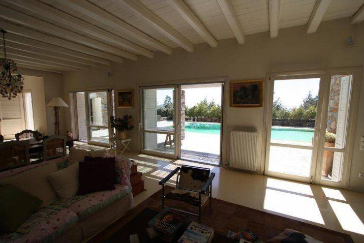 367 sq.m. Villa with 3 levels. The 1st level of 140 sq.m. has a living room connected with the dining room and a fireplace (110 sq.m.), 1 master bedroom, and 1 WC at the pool level. The 2nd level of 92 sq.m. with 1 master bedroom with fireplace, 1 bedroom, and 1 bathroom, huge terraces overlooking the sea. Offers a widescreen LCD TV, multi-channel TV, and an in-room mini-fridge. The mezzanine of 137 sq.m. with parking space and auxiliary spaces. In addition, the 3 levels communicate with an internal elevator and an internal staircase. The surrounding area 2000 sq.m. with a garden, pool, and parking spaces. The building is half with Karystos stone as well as the outdoor areas. The main entrance is a sliding wooden door with an automatic opening. It can also be sold furnished as shown in the photos. It is just 1 km from the city center Aetos is known for Marmara Beach and 3 km from the port of Karystos.