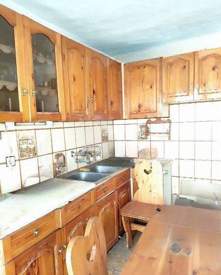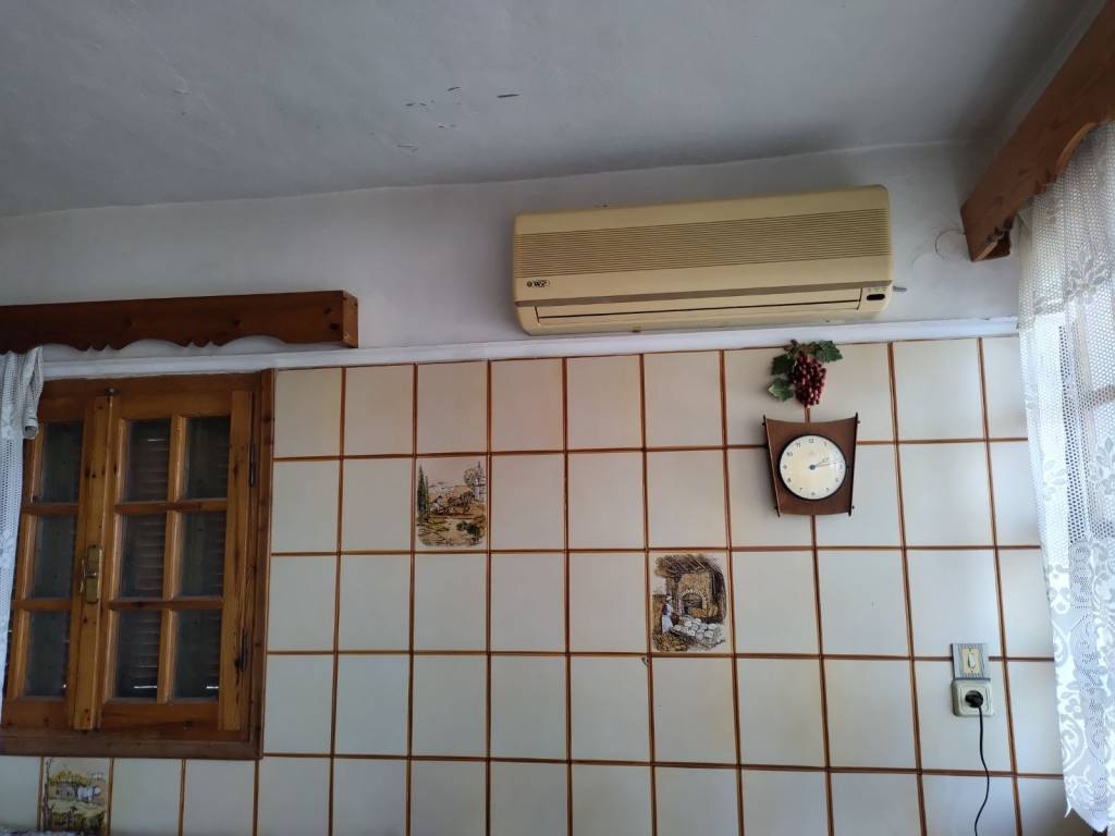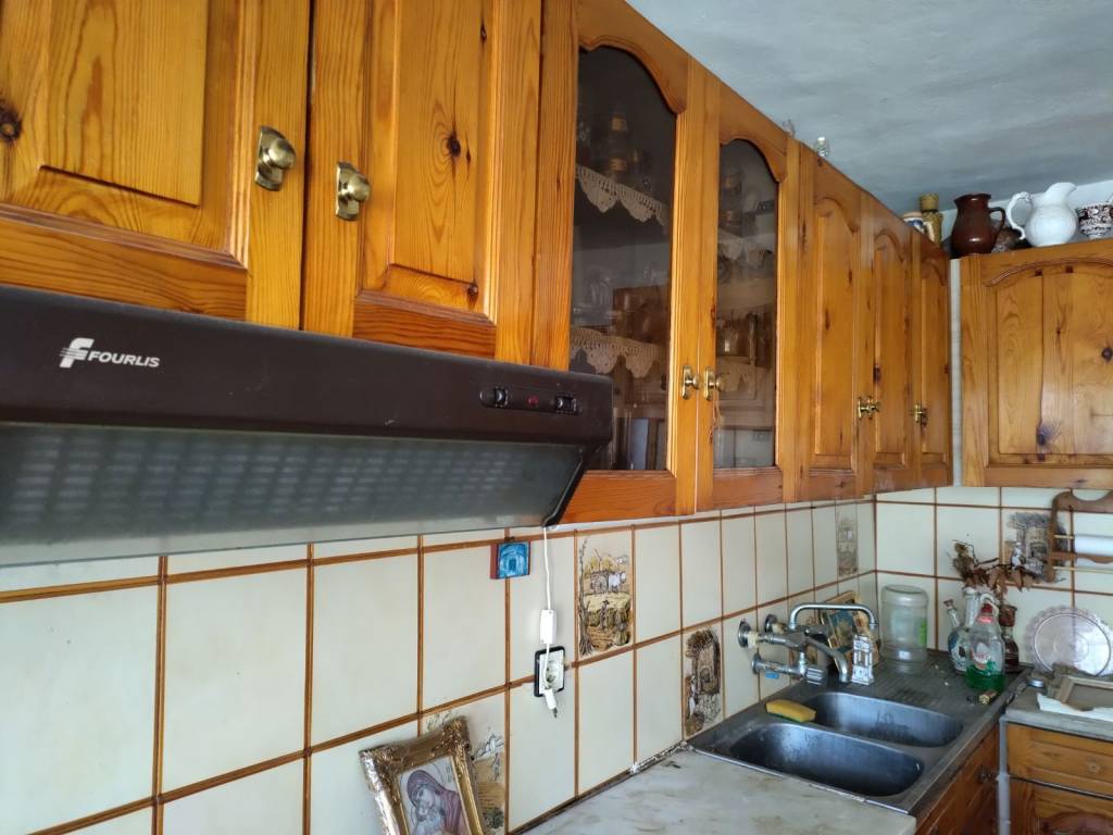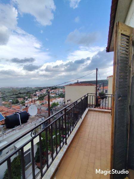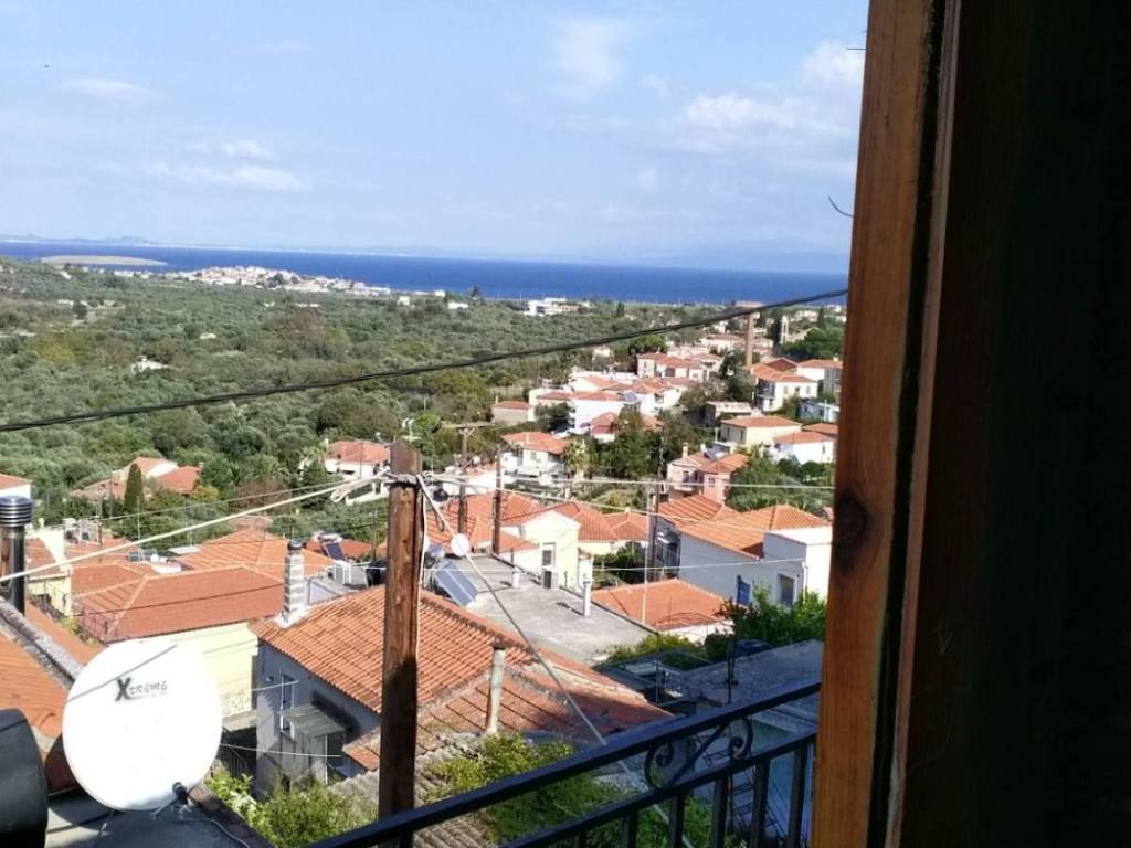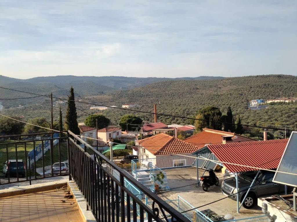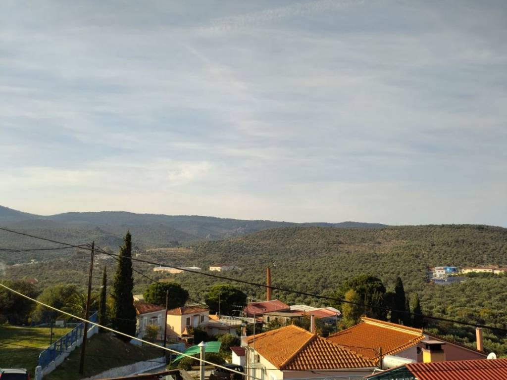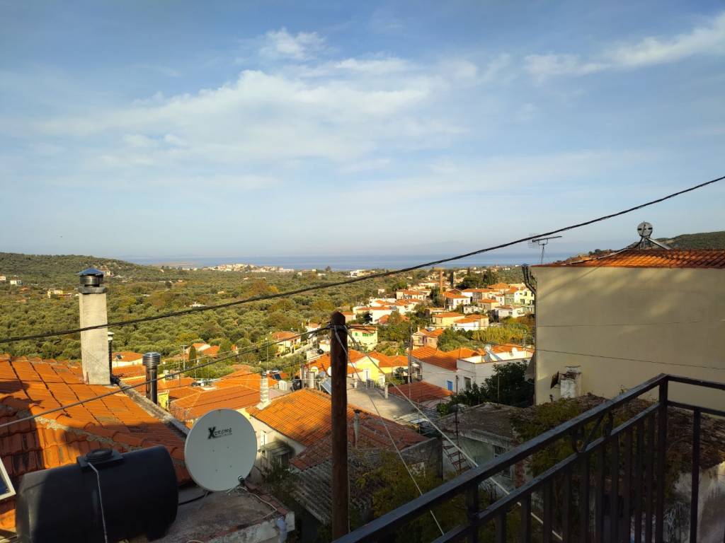 A two-level house of total surface 114.90 sqm is offered for sale on a plot of 84.06 sqm, built in 1987, located in the Agios Dimitrios area in Moria, Lesvos, with frontage on a community road. The property is situated in a quiet location and enjoys unobstructed 180° panoramic views of both sea and mountain. The house is developed over two levels. The ground floor consists of an entrance hall, kitchen, open-plan living and dining area, and a bathroom. An internal wooden staircase leads to the first floor, which includes two bedrooms, one of which features a built-in wardrobe and access to a balcony with open views, as well as an office space, hall, and a second bathroom. At the ground floor level, before the main entrance, there is an independent auxiliary space of 18.47 sqm, which can be used as storage or for additional practical purposes. The property offers the possibility of being configured into two independent apartments, making it suitable both for private residence and for investment use. It is a fully legalized property, with an issued Energy Performance Certificate, ready for immediate transfer. The property requires partial renovation, offering the opportunity for customization according to the buyer’s needs.