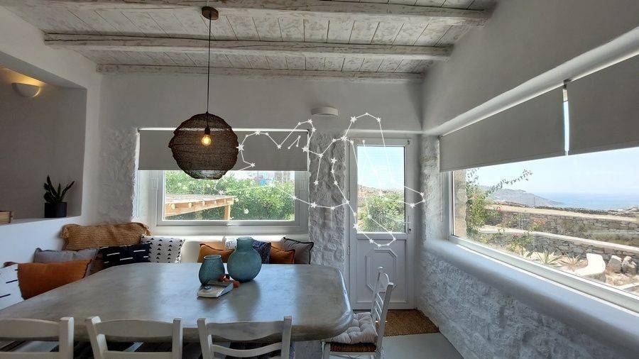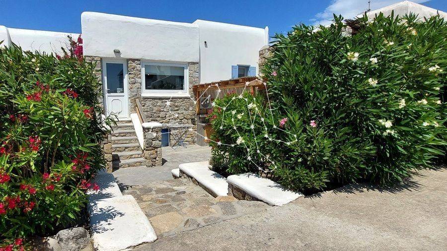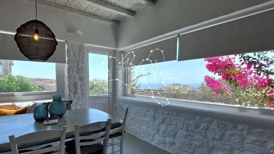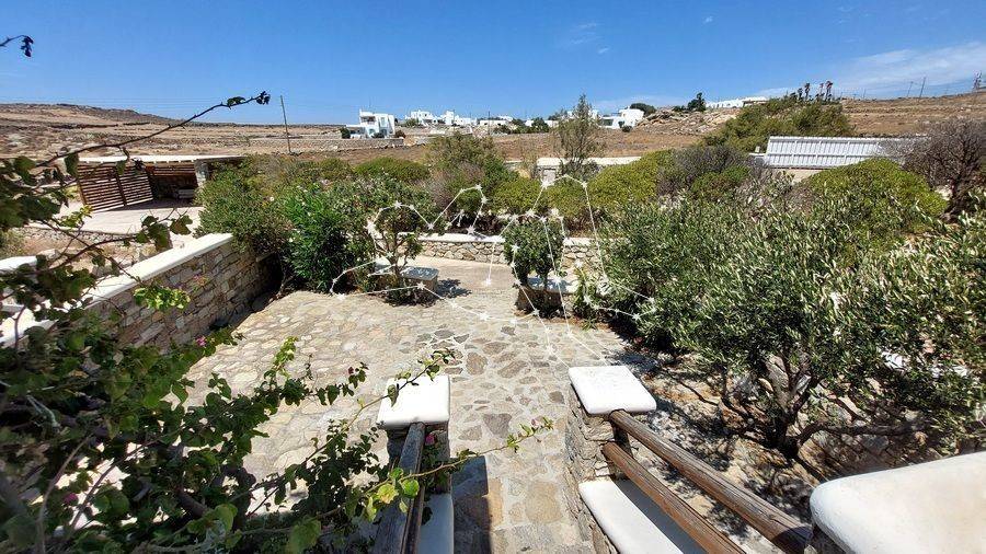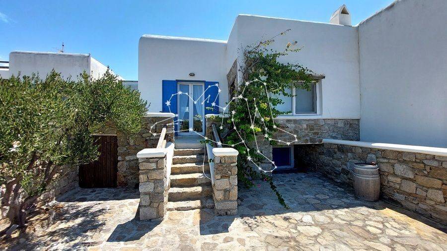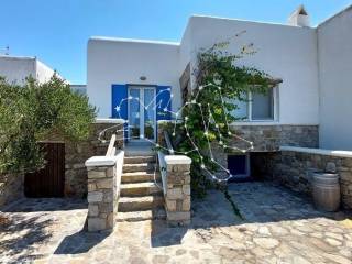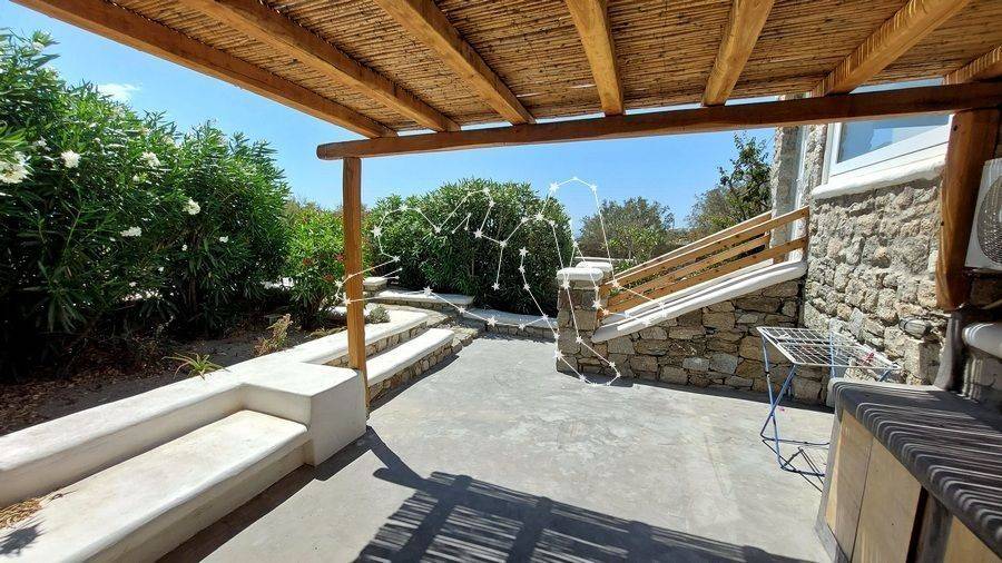 MAISONETTE WITH VIEWS NEXT TO ORNOS The maisonette with views next to Ornos is in the Ano Diakoftis area that benefits from far reaching sea views. It is the perfect place to unwind and escape the bustle of the island, being just a few steps away from all amenities. ACCOMMODATION LAYOUT The fully furnished and equipped maisonette is spread over 2 levels: the raised ground floor and the lower ground level. The main entrance to the house is on the top level, which comprises: the reception area, a small lounge, the dining area, the fully equipped kitchen, and the main living area with the fireplace. A guest WC is also included on this level. A built staircase leads to the lower ground level, which has windows for natural ventilation and lighting in all rooms. This level includes all three (3) bedrooms, as well as a shared comfortable bathroom. OUTDOOR AREAS The property is embraced by two (2) spacious patios, fenced with white picket stonewalls. Both patios feature lush flower beds that enhance the property’s relaxing feeling. The front patio leads to the house’s main entrance, while the one on the house’s back side features a pergola-covered area featuring an al fresco lounge with built sofa. INVESTMENT PROPERTY The maisonette with views is in Ano Diakoftis, in the greater area of Ornos, which is of very high demand for both real estate sales and rentals. The location and the property’s features make it an attractive investment that can ensure a high return on invested capital. DISTANCE FROM - Ornos village: 1,300 m. - Mykonos Town: 3.5 km - International airport: 4.5 km - New Port marina: 7 km