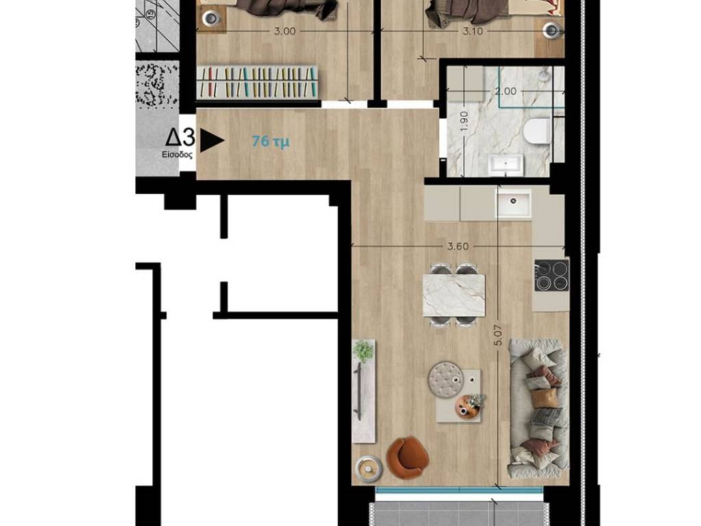 Building of modern architecture, luxurious construction. Apartment D3 on the 1st floor of Building Γ with an area of 76,88 sq.m. offers a spacious living room, two rooms and a bathroom. . The clever design focuses on making full use of the space creating an aesthetically excellent and fully functional environment with high levels of ergonomics. A storage room and a parking space complete the property's spaces. It has underfloor heating, large terraces, pre-installation of solar water heater, alarm, air conditioning, satellite, internet. Large openings that give absolute brightness to the space. It is high energy class A+ with thermo-facade shell, excellent insulation on floors and walls, security front door, energy thermally isolating - soundproof external frames with double glazing, tile floors 60x120. There is the possibility of your personal choice and intervention in the materials, as the apartment is under construction. The project is scheduled to be completed in mid 2026. Other apartments from 95 & 107m2 are also available.