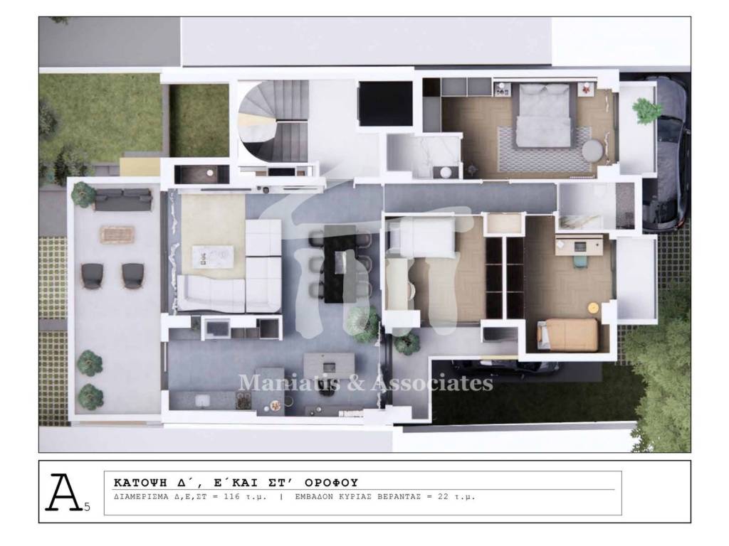 Apartment For Sale. Floor apartment 116 sq.m. of special architectural aesthetics, with sea view, airy, energy class A, large living room, dining room, kitchen with island, 3 bedrooms, 1 bathroom and 1 W.C., large main terrace (3.00 *7.50) and auxiliary. Storage room, covered parking space on the ground floor or closed basement with independent garage door, fireplace, security door, alarm pre-installation, solar water heater, air conditioners type split units, pump heat with heating/cooling fan coils or medium temperature radiators, installation of an independent natural gas boiler gas, power supply for electric car charging, provision for future fast charger, distributor fiber optic, intercom at both entrances, fire detection of common areas. Price: 460,000. Maniatis & Associates, Contact Phone: 2104190703, email: info@e-mesitis.com, website: www.e-mesitis.com