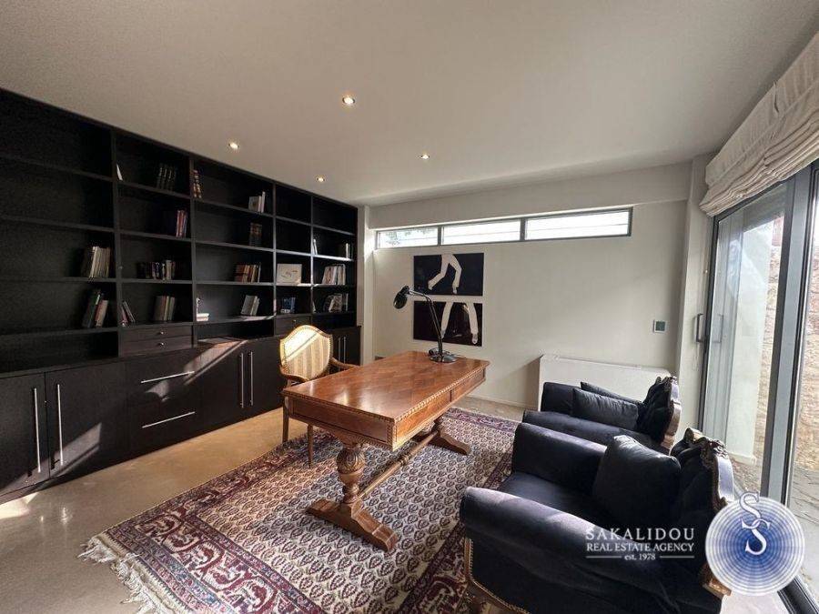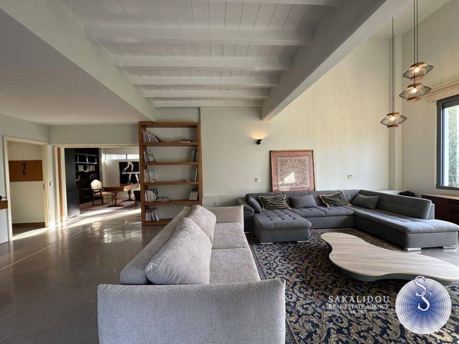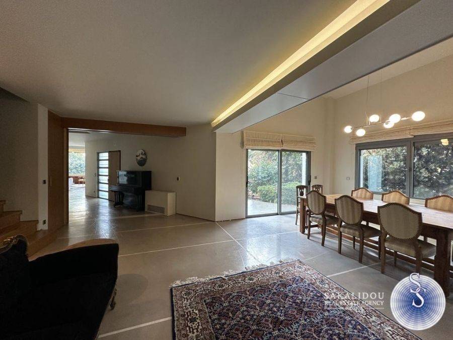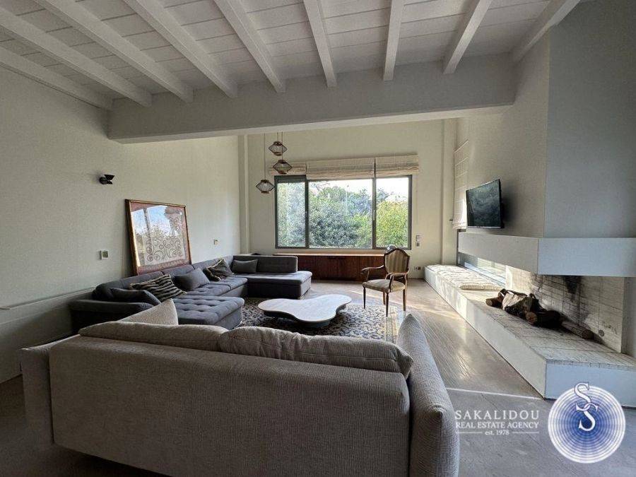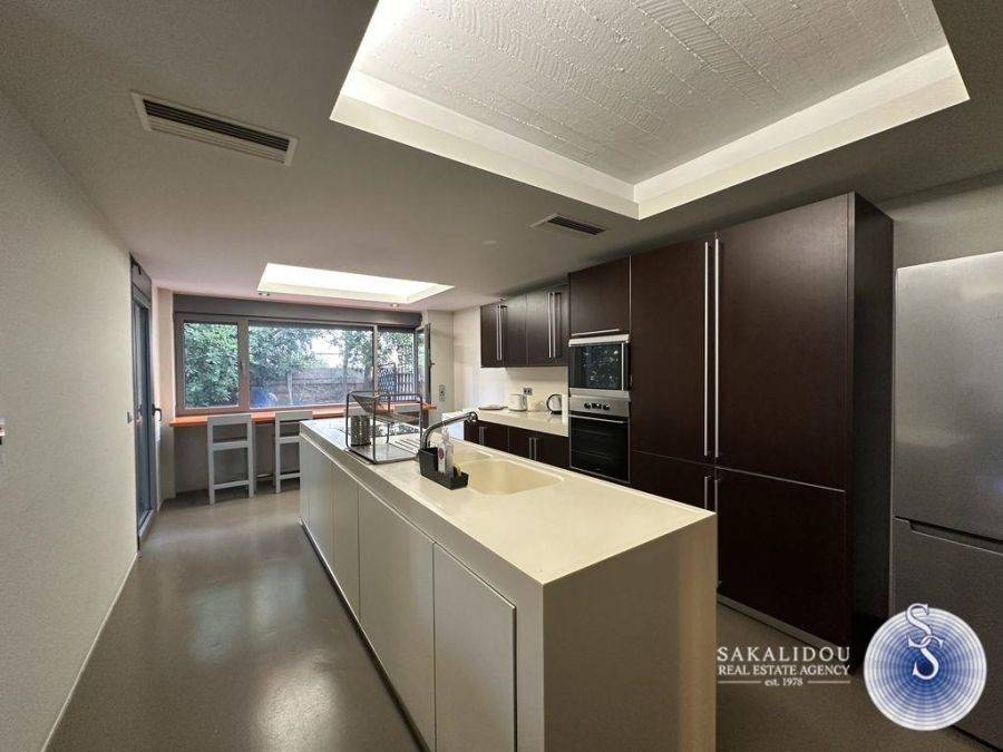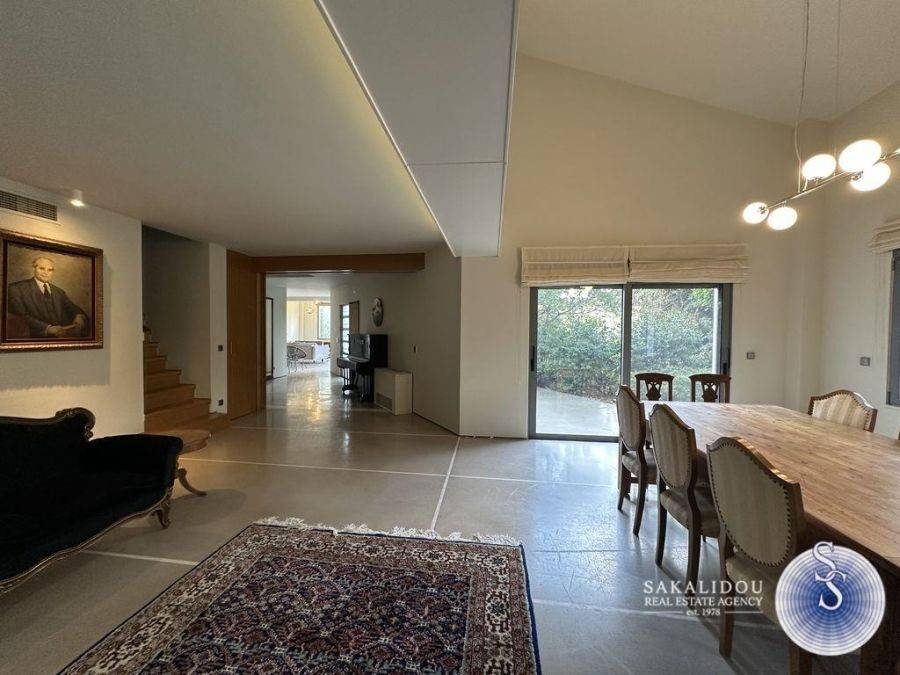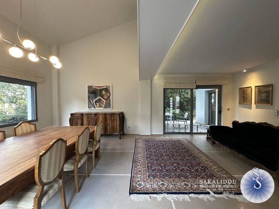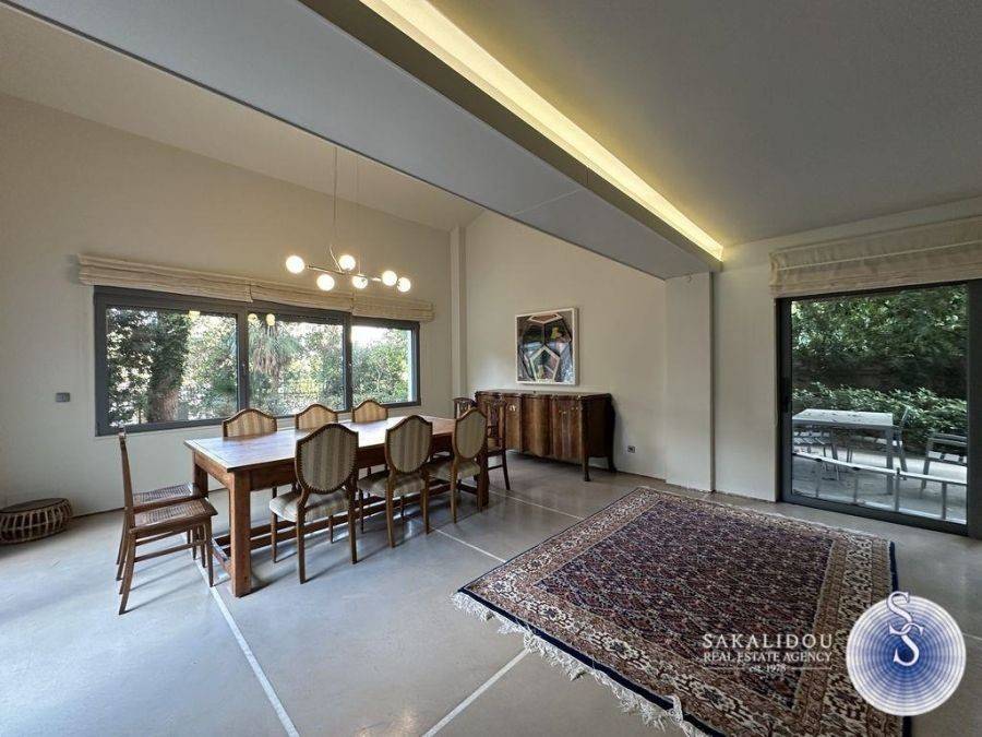 Glyfada, center, in the best area, 200 meters from the sea, ground floor maisonette of 2 levels, luxury and minimal design, from a famous architect, 380 sq.m with amazing garden and big trees. It consist of spacious living area with fireplace, modern kitchen fully equipped with electrical appliances, 4 bedrooms, one is master with walk in closet and en-suite bathroom. It has a central A/C, swimming pool, alarm system, 3 parking spaces, storage room.