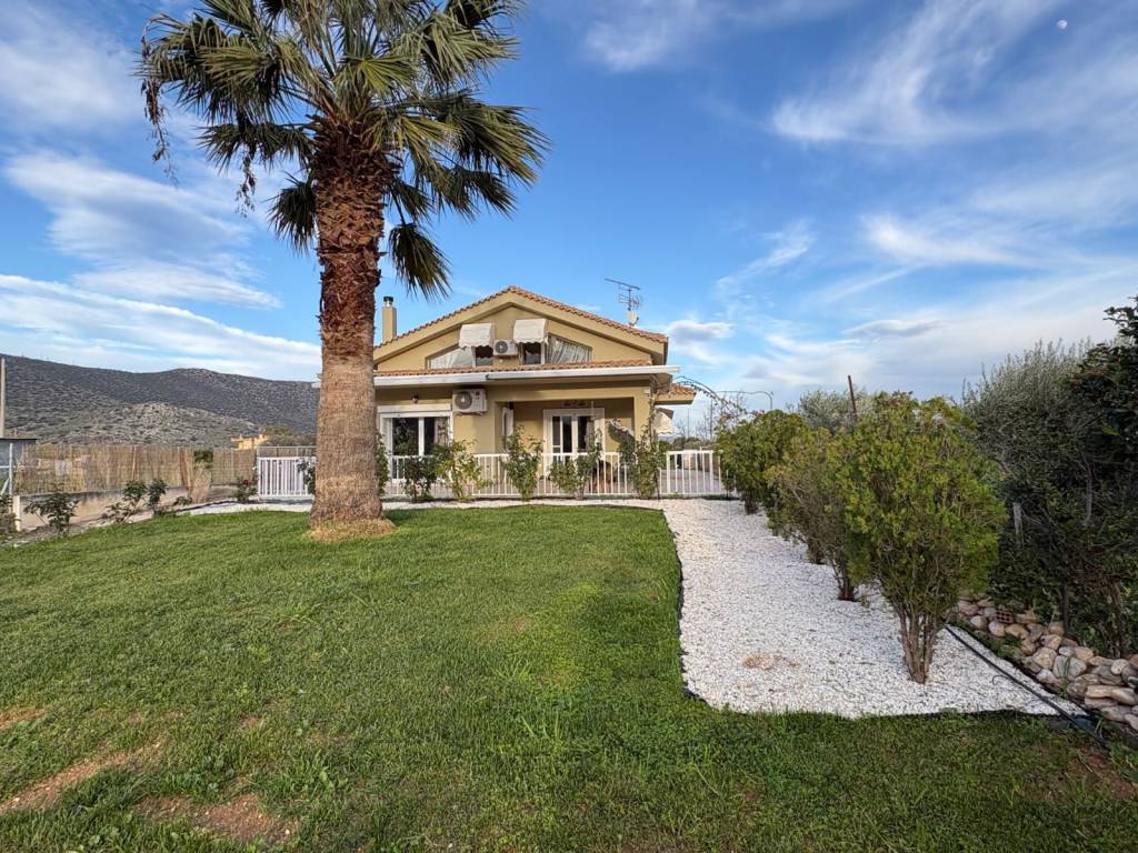 Welcome to Villa NET. This is a wonderful villa renovated in 2024, on a beautiful farm in the Marathon Beach area. Total area of the property, 3.23 sq m Total area of the house 200+ Starting with the ground floor, you enter a huge space with plenty of light - living room and dining room where you find an energy fireplace, the kitchen (16 sq m), a guest bedroom with its own bathroom and closet. A WC as well as a laundry room. On the first floor there are 2 master bedrooms with their own bathrooms and closets. The whole house has wooden floors. The heating is with a heat pump. Aluminum windows with glass and screens next to them. LG A/C in the living room and in the two bedrooms upstairs. The house has full autonomy in electricity as it has the latest generation photovoltaics and a 5-cubic meter tank for autonomy in water For security reasons, the house has an alarm and perimeter cameras. The surrounding terraces of the house are covered with electric awnings. In total, there are 25 olive roots and other trees on the property, such as 2 palm trees, etc. The back has an electrically opening-illuminated pergola of 60 sq m. which is used for parking and is in contact with the back door of the kitchen so you can put the groceries in directly. Also, in the back there is a BBQ.