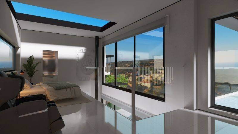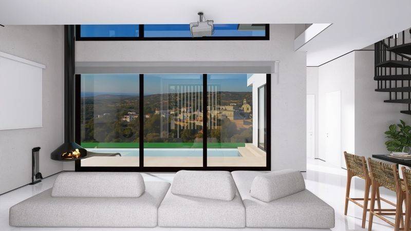 The villa features 2 bedrooms with 2 bathrooms on each level, a private pool, BBQ area, a storage room and a large terrace on the first floor with breathtaking sea and mountain views. The interior boasts a loft-style layout with bright, sunny rooms, thanks to large openings that bring in natural light.