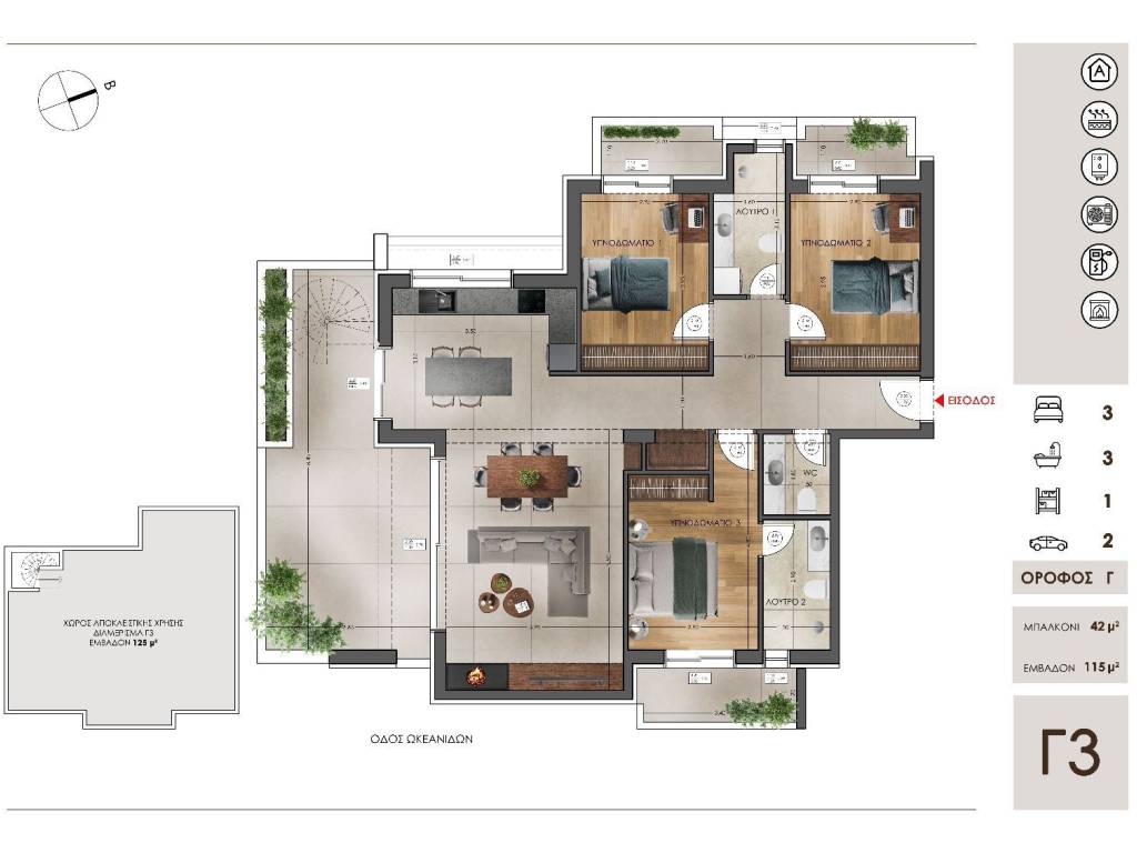 Διαμέρισμα 3ου ορόφου (ρετιρέ) με roof garden, εμβαδού 115 τμ σε υπό κατασκευή κτίριο τριώροφο κτίριο κατοικιών σε πολύ ήσυχο σημείο κοντά στο δαχτυλίδι της Αττικής οδού. Το διαμέρισμα διαθέτει καθιστικό - τραπεζαρία ενιαίας διαρρύθμισης, κουζίνα με νησίδα σε open plan σχεδιασμό, μεγάλα ανοίγματα για φυσικό φωτισμό, 3 υπνοδωμάτια με 2 μπάνια και 1 wc, roof garden με πρόσβαση από το μπαλκόνι του διαμερίσματος. Σύστημα κλιματισμού με αντλία θερμότητας και ενδοδαπέδια θέρμανση, πόρτα ασφαλείας, θερμοπρόσοψη 10 εκ, επώνυμα ενεργειακά κουφώματα θερμοδιακοπής, σίτες, ηλεκτρικά ρολά στα υπνοδωμάτια, ενεργειακό τζάκι, επώνυμοι προμηθευτές για κουζίνα, ντουλάπες και δάπεδα, μεγάλη αποθήκη το υπόγειο, 2 θέσεις στάθμευσης (υπογείου & πυλωτής) με παροχή για ηλεκτρική φόρτιση αυτοκινήτου, χώρος αποκλειστικής χρήσης για κατασκευή ατομικού φωτοβολταικού στο δώμα , ενεργειακή κατηγορία Α. Παράδοση Ιούνιος 2027. Αγγελία από Κατασκευαστική Εταιρεία. Περισσότερες επιλογές και πληροφορίες: www.dekadevelopments.gr , τηλ. 210 7006852 , sales@dekadevelopments.gr