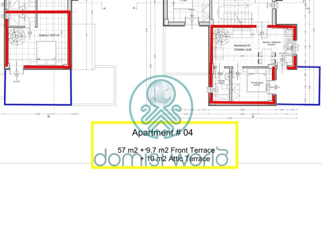 Duplex apartment (1 st & 2 rd floors): 57 sq/m area. The apartment includes two bedrooms, two bathrooms, living area and a fully equipped kitchen.