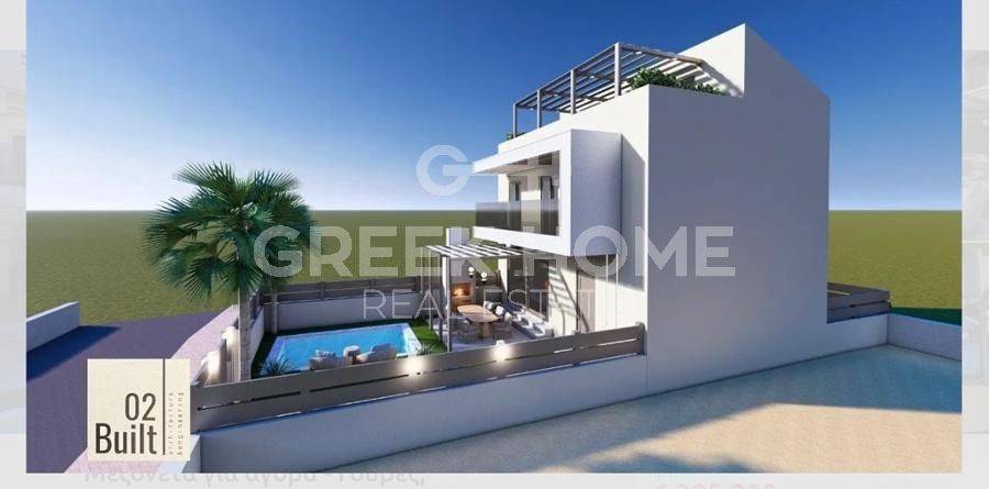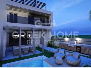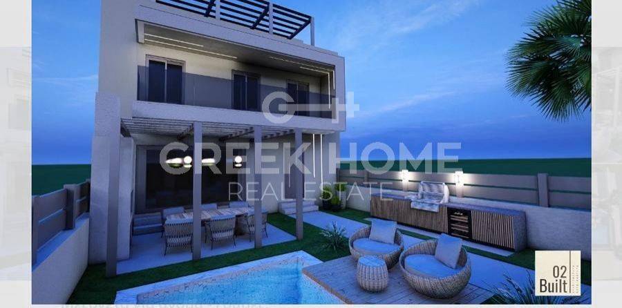 Gouves, Hani Tou Kokkini - Detached House 160sqm plot 190sqm, bedrooms 3, levels 2, ground floor - 1st, under construction, constructionstage plots, year built 2025, energy class A+, living room, kitchen, bathroom, 2 wc, heating type: autonomous (oil), quiet, dual aspect apartment, luminous, frontage, storage space, solar heater, balconies, large balconies, loft storage, garden, aluminum frames, double glazed windows, door screen, ceramic tiles floors, luxurious, private pool, internal staircase, sea front, western orientation.