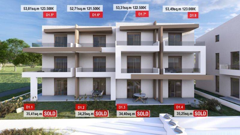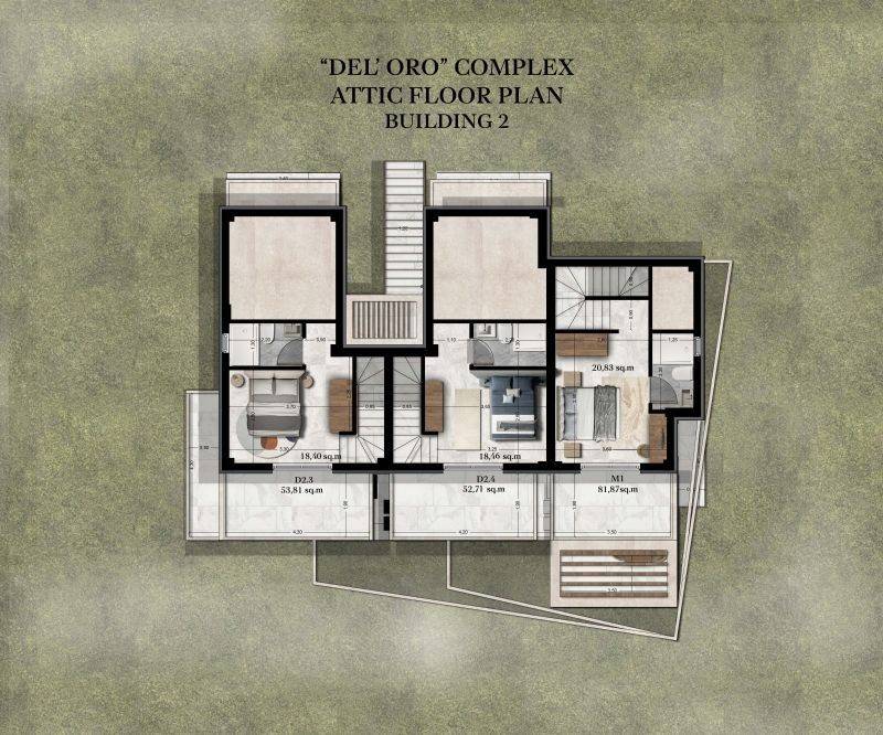 • 6 First-floor apartments with attic space ranging from 52.76 m² to 53.98 m², consisting of a living room with kitchen, 2 bedrooms, and 2 bathrooms.