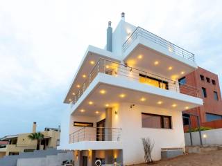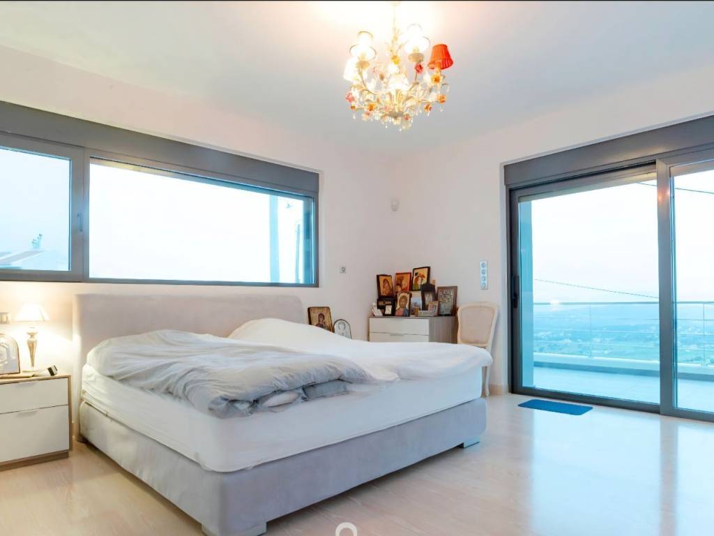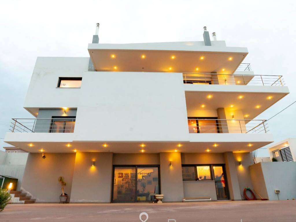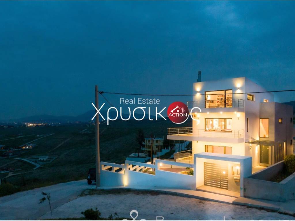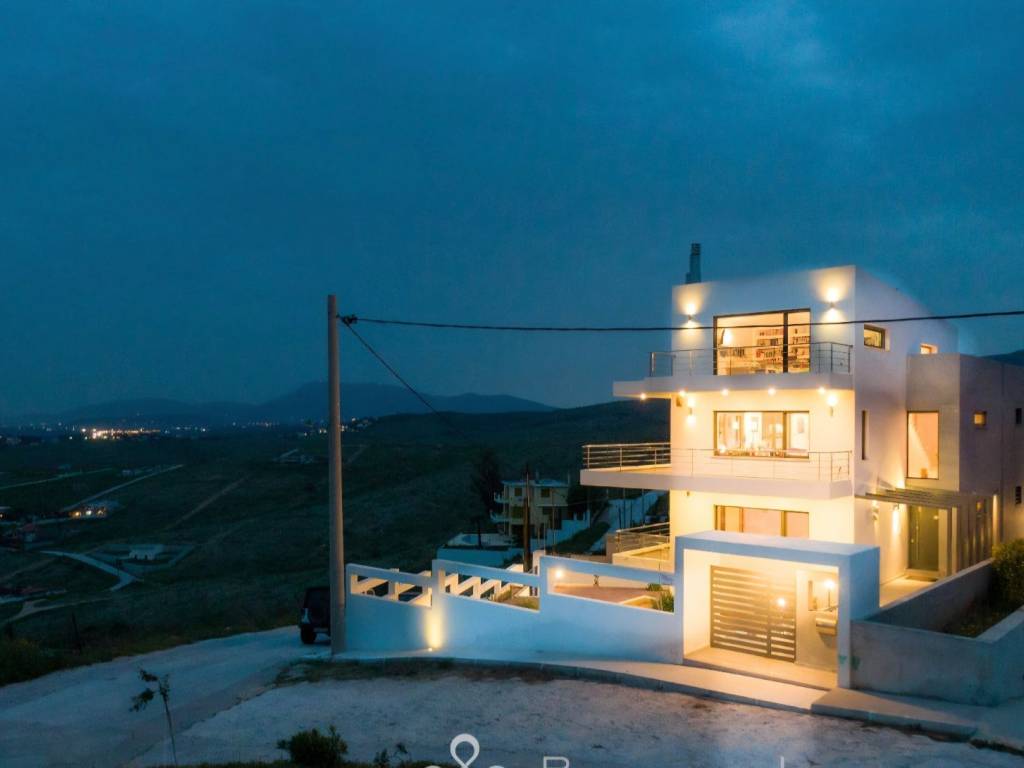 CHRYSIKOS REAL ESTATE Unique, luxurious property for sale, at Neos Voutzas, Attica, Athens, Greece Luxury, "green", in modern architectural design multilevel residence, with panoramic and incomparable view over Evoikos Bay and across the entire Attica basin, is for sale. It is built in 2011, at the edge of a hill, adjacent to a public triangular garden-land, in a two - street faced terrain of 600 m2 and has a living capacity of 489 m2. It is colored in white, with gray doors, rolls and window frames. Balconies’ baluster by stainless steel. The residence is situated in the settlement of Neos Voutzas, neighboring with the cities of Marathon and Rafina, at the east cost of Attica. The nearest sea side is a few km away, while the Athens International airport, been viewed by the house, lies less than 20 minutes of driving. Main Features: ♦ The residence possesses a license for pool, which has not been built. In place, a layer of a hard resistant wooden deck has been installed, covering in style, a portion of the front yard. ♦ The climatization is provided by a Hydro electrical heat-cool pump. It is equipped with a latest technology sophisticated alarm system, by Tecnoalarm. ♦ The security doors are manufactured by Siamo. ♦ The elevator is 7 persons’ Kleeman, with 4 stops. The house is erected in 5 levels: On the ground floor, there are: ♦ The main entrance ♦ The reception hall, with a ceiling height of 5.5 m, supervised by a skylight with extra security glass by “COSPICO” on the roof. ♦ The visitors wardrobe ♦ The staircase ♦ The master bedroom with 5 meters of closets and two bathrooms, one with Jacuzzi. A walking-through room to the bathrooms with 10 meters of wardrobe closets. ♦ Second bedroom with bathroom-shower hydro massage. ♦ Balconies and windows in the perimeter. On the first floor, there are: ♦ The dominant, 150 sq meters open plan lounge - living room with fireplace and dining area and a pass from “Serena” marble. ♦ A modern, luxurious cuisine of crystal, by the Italian House Zacarioti with ten meters countertop from rock crystal - quartz. ♦ The kitchen is equipped with custom fitted Miele appliances (dishwasher, induction hob 90 cm, and an exquisite coffee maker), Gaggenau (oven and oven steam) whilst the state of the art oven hood-fixture is by Falmec. ♦ A small spaced storage room. ♦ An elegant guest WC. ♦ The lighting chandeliers are from Swarovski crystals by KOSTIS Inc. ♦ Long-wide balconies in the perimeter. Loft (fifth level): ♦ Above the first floor there is the roomy loft with the superb view. It has a large balcony, custom fitted library of plasterboard and a kitchenette with a small fridge. ♦ All the above described sites are equipped with floors made from genuine outstanding style 2 cm thick oak wood, solidly welded. The stair steps of the residence are also covered by the same material. On the 1st level basement, there are: ♦ Due to the mild downhill landscape, this level is facing the ground on the east side. It has exit to the wooden deck yard by safety glass sliding doors, a window and a single door. It features a large living room with fireplace, contiguous kitchen with built-in AEG home appliances, and bathroom with hydro massage shower. ♦ Also, one bedroom (guest house or service room), with a full bathroom, kitchen and a separate security entrance, internally, and on the outside. ♦ The floor of this level is covered by gray granite 60x60 tiles. On the 2nd Level basement (underground) there are: ♦ The car entrance to the underground basement is by a shallowly sliding ramp. Flooring from industrial concrete, is 150 sq m of space, with three+ parking spots, laundry room and 2 more utility rooms for any use. ♦ It is equipped with 2 automatic garage doors, by Xofakis, one safe internal; and one outdoors, at the entrance of the ramp. ♦ The elevator mechanism room, the hot water boiler, the heating automations equipment as well as the electric general switch boards - electronics controls are located there. The roof of the building is from concrete. A large portion of it is covered by tiles. The rest is flat bed, in which the heat pump is installed. This electrical pump, installed by Ergon, provides the residence with heat and/or cool, via under-floor installation of coil tubes. Apart from the healthy green energy this causes savings of around 60–70% in heating-cooling costs compared to other sources. The balconies’ doors, windows the safety metal rolls and their frames are made by SHUCCO installed by Ergon, with special energy, double and/or bulletproof glasses where it is required. The property’s State building permission is of the year 2009. Construction completed by 2011. Contact numbers: 2421409131, 6906893512