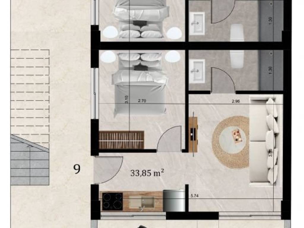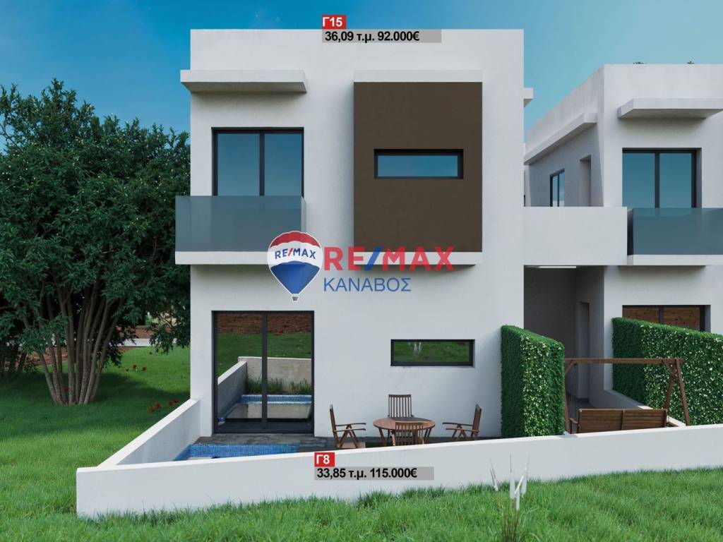 Apartment For sale, floor: 1st, in Komotini. The Apartment is 49,91 sq.m. and it is located on a plot of 695,80 sq.m.. It consists of: 2 bedrooms, 1 bathrooms. The property was built in 2024. Its heating is Autonomous with Electricity, Air conditioning, Solar water system, Sound insulation, Thermal insulation are also available, it has Synthetic frames with Double glazed windows, the energy certificate is: A and its floors are Tiles. The property's status is: New development, it has Openness view and it has South orientation. The Apartment is With Facade, Lower level house, Luxury, Swimming pool, Garden. Price: €126.000. RE/MAX Canavos, contact phone: 2541083152, email: info@remaxcanavos.gr, website: