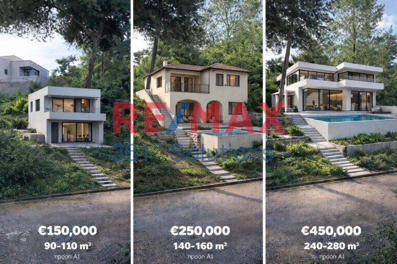 Συμπεριλαμβάνονται εικονικές φωτογραφίες (προϊόν ΑΙ) ως ενδεικτικά παραδείγματα, με σκοπό την απεικόνιση του δυναμικού και των δυνατοτήτων διαμόρφωσης του οικοπέδου με διαφορετικό κόστος κατασκευής.