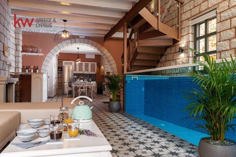 Residence B – 161 m² (Newly Built, 2020) An impressive two-storey residence, one of the very few newly built properties in the Old Town, featuring modern installations, premium finishes and elegant architecture. The ground floor includes an open-plan living area with a fireplace, a heated indoor pool with reinforced glazing and atmospheric lighting, a laundry room and a full guest bathroom. The kitchen showcases rustic elements, ample storage, built-in INOX appliances and preserved details from the original structure that once stood in its place. The upper floor features a living area suitable for additional guests, a bedroom with an ensuite bathroom, a second private bedroom and a spacious main bathroom. Its corner orientation ensures abundant natural light throughout the entire residence and enhances the overall sense of openness.