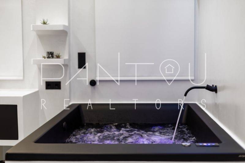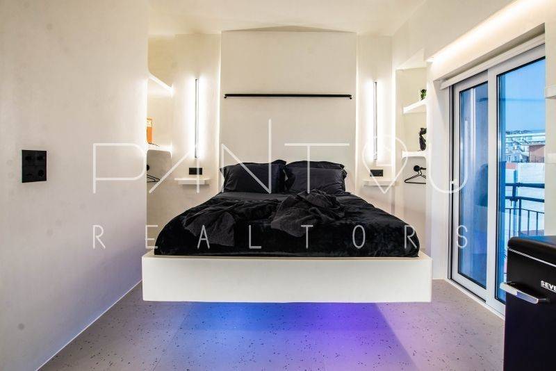 The experience begins with architectural purity: white micro-cement coating across all internal walls, suspended bespoke furniture, high-end appliances, and a built-in floating bed that gives the space that rare “gallery-calm” sought by Athens’ international audience.