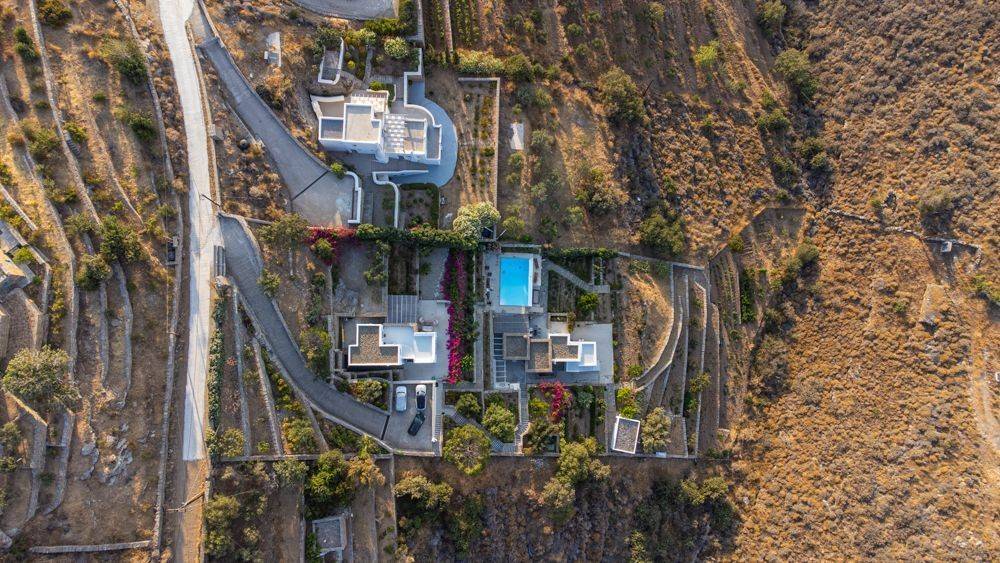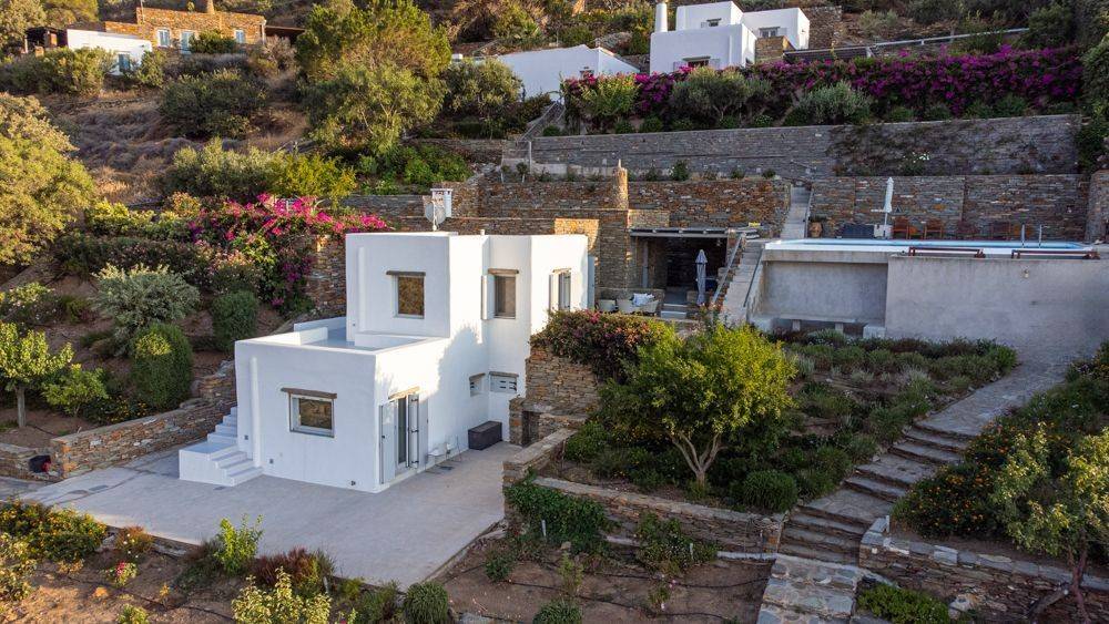 Two maisonettes with sea view, in the area of Otzias in Kea. The 2 houses, with a total area of 284 sq.m., are located on a sloping plot of 4,000 sq.m. and offer a wonderful view. The first residence occupies 131 sq.m. and offers on the ground floor living room/dining room with fireplace, open plan kitchen, 2 bedrooms, 1 bathroom and W.C. On the 1st floor are 2 additional bedrooms that share 1 bathroom. The second residence of 153 sq.m. has on the upper level a living room/dining room with fireplace, open plan kitchen, 1 bedroom with en-suite bathroom, and W.C. The ground floor consists of 2 bedrooms with en-suite bathrooms, maid's room, laundry room and W.C. In the beautifully landscaped surroundings, there is a shared swimming pool, living, dining, and BBQ areas. In addition, the property has 2 warehouses and parking. The island of Kea (also sometimes called Tzia) is well known for its exceptional beaches and some of the best walking paths and trails of any of the Greek islands. Relatively close to the Attica peninsula of the Greek mainland, Kea is easily accessible (1 hour by ferry to Lavrio port) and offers stunning scenery made up of mountains, olive groves, vineyards, picturesque coves and the superb beaches. Villa Gemini is located close to Otzias beach, 4 km from Vourkari Marina and 5 km from Korissia port,